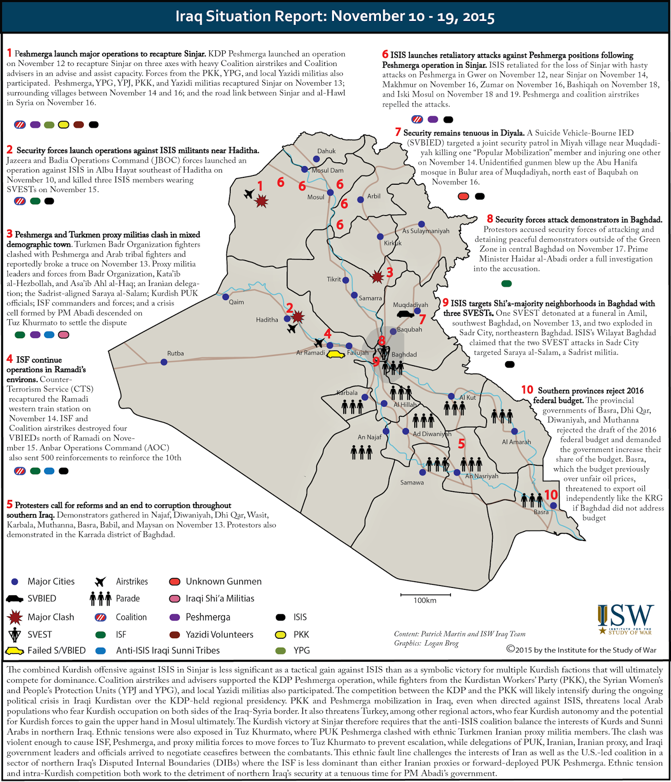 Key Take-Away: The combined Kurdish offensive against ISIS in Sinjar is less significant as a tactical gain against ISIS than as a symbolic victory for multiple Kurdish factions that will ultimately compete for dominance. Coalition airstrikes and advisers supported the KDP Peshmerga operation, while fighters from the Kurdistan Workers’ Party (PKK), the Syrian Women’s and People’s Protection Units (YPJ and YPG), and local Yazidi militias also participated. The competition between the KDP and the PKK will likely intensify during the ongoing political crisis in Iraqi Kurdistan over the KDP-held regional presidency. PKK and Peshmerga mobilization in Iraq, even when directed against ISIS, threatens local Arab populations who fear Kurdish occupation on both sides of the Iraq-Syria border. It also threatens Turkey, among other regional actors, who fear Kurdish autonomy and the potential for Kurdish forces to gain the upper hand in Mosul ultimately. The Kurdish victory at Sinjar therefore requires that the anti-ISIS coalition balance the interests of Kurds and Sunni Arabs in northern Iraq. Ethnic tensions were also exposed in Tuz Khurmato, where PUK Peshmerga clashed with ethnic Turkmen Iranian proxy militia members. The clash was violent enough to cause ISF, Peshmerga, and proxy militia forces to move forces to Tuz Khurmato to prevent escalation, while delegations of PUK, Iranian, Iranian proxy, and Iraqi government leaders and officials arrived to negotiate ceasefires between the combatants. This ethnic fault line challenges the interests of Iran as well as the U.S.-led coalition in a sector of northern Iraq’s Disputed Internal Boundaries (DIBs) where the ISF is less dominant than either Iranian proxies or forward-deployed PUK Peshmerga. Ethnic tension and intra-Kurdish competition both work to the detriment of northern Iraq’s security at a tenuous time for PM Abadi’s government.