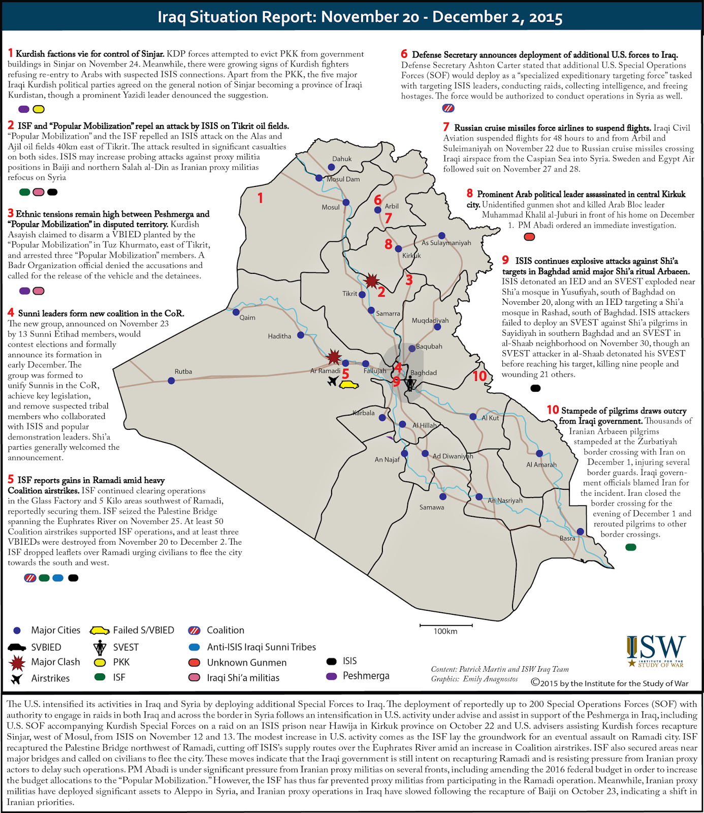 The U.S. intensified its activities in Iraq and Syria by deploying additional Special Forces to Iraq. The deployment of reportedly up to 200 Special Operations Forces (SOF) with authority to engage in raids in both Iraq and across the border in Syria follows an intensification in U.S. activity under advise and assist in support of the Peshmerga in Iraq, including U.S. SOF accompanying Kurdish Special Forces on a raid on an ISIS prison near Hawija in Kirkuk province on October 22 and U.S. advisers assisting Kurdish forces recapture Sinjar, west of Mosul, from ISIS on November 12 and 13. The modest increase in U.S. activity comes as the ISF lay the groundwork for an eventual assault on Ramadi city. ISF recaptured the Palestine Bridge northwest of Ramadi, cutting off ISIS’s supply routes over the Euphrates River amid an increase in Coalition airstrikes. ISF also secured areas near major bridges and called on civilians to flee the city. These moves indicate that the Iraqi government is still intent on recapturing Ramadi and is resisting pressure from Iranian proxy actors to delay such operations. PM Abadi is under significant pressure from Iranian proxy militias on several fronts, including amending the 2016 federal budget in order to increase the budget allocations to the “Popular Mobilization.” However, the ISF has thus far prevented proxy militias from participating in the Ramadi operation. Meanwhile, Iranian proxy militias have deployed significant assets to Aleppo in Syria, and Iranian proxy operations in Iraq have slowed following the recapture of Baiji on October 23, indicating a shift in Iranian priorities.