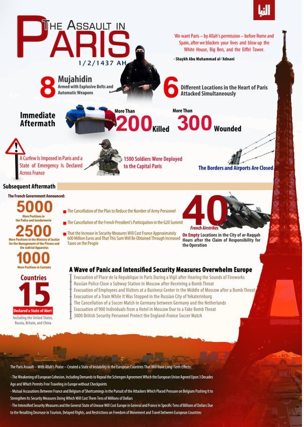 ISIS also aims to destabilize Europe more broadly through spectacular attacks. ISIS seeks to exacerbate tensions between European states, raise defensive requirements within those states, cause an environment of fear, and inflict additional economic damage on Europe. An official ISIS media outlet affirmed each of these operational objectivesin a publication released January 2016. The graphic claimed the November 2015 Paris attacks “[weakened] European cohesion” and caused “demands to repeal the Schengen Agreement.” It also argued that the Paris attacks caused tension between France and Belgium over intelligence failures. It celebrated how the attacks created a “general state of unease” and predicted that decreased tourism revenues and increased security requirements would cost Europe “tens of billions of dollars.” ISIS’s directed and inspired attacks set conditions for the organization’s desired apocalyptic war by draining resources and exacerbating internal conflict in the West.