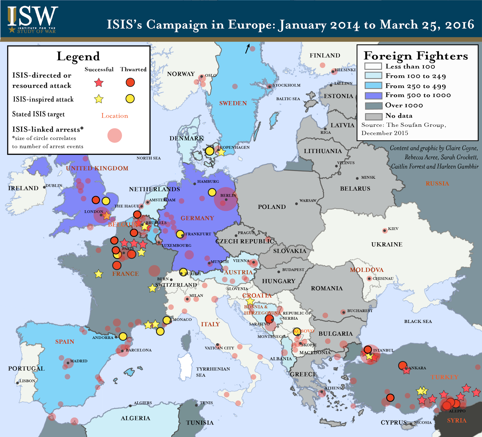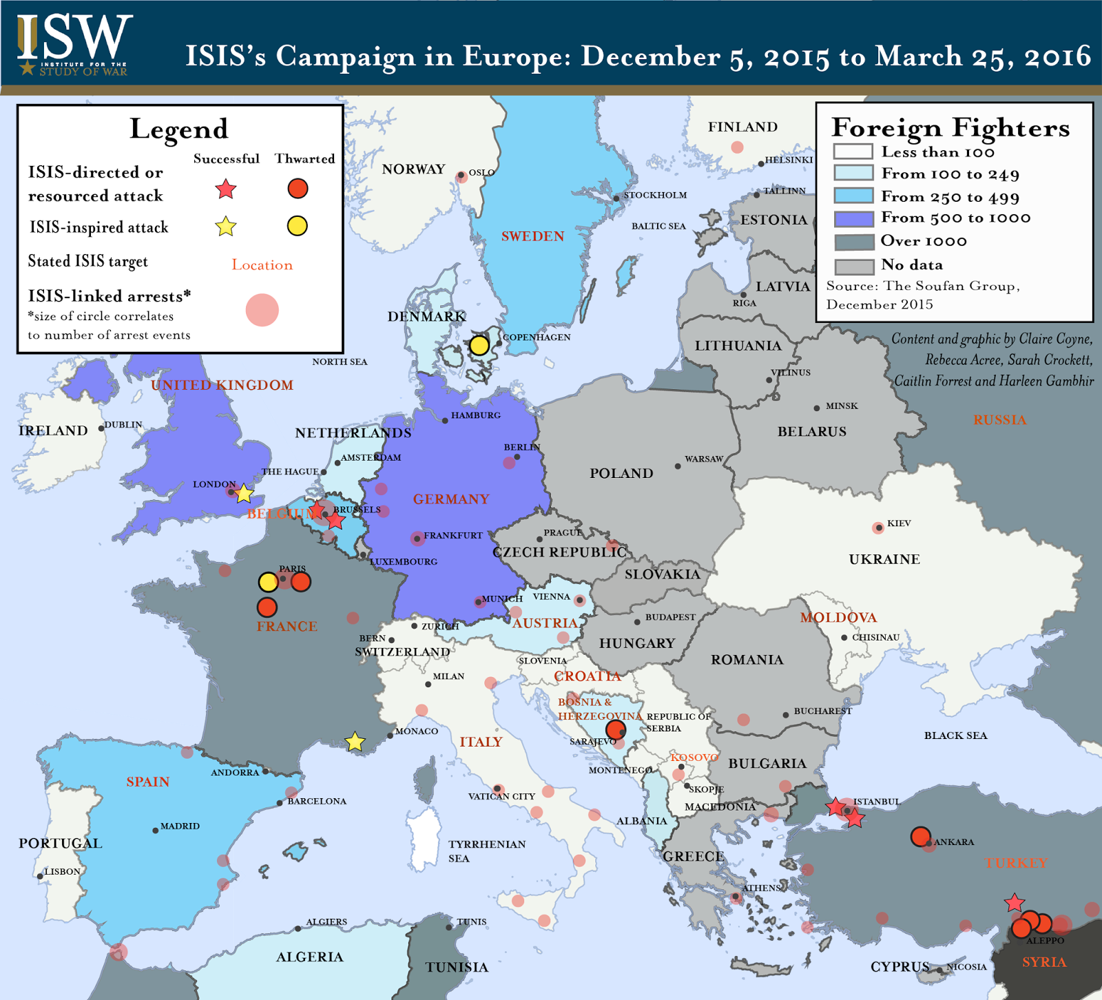 ISIS is using its foreign fighters and safe haven in Iraq and Syria to execute a terror campaign within Europe. ISIS’s March 22 Brussels attacks support a larger strategy to punish, destabilize, and polarize the West. ISIS will likely continue to attempt attacks in France and Belgium in 2016, using its large Francophone foreign fighter population and local supporters. ISIS’s support networks in southern Europe may enable ISIS’soperatives to launch operations in other parts of the continent, including Austria, Germany, Spain, and Italy. ISIS may also increasingly target Westerners in Turkey in order to punish members of the anti-ISIS coalition and undermine the Turkish economy, as part of its stated objective to seize Constantinople. Current efforts to address these threats through law enforcement, surgical strikes on ISIS’s leadership, and linear attrition ofISIS’s terrain and resources are necessary but not sufficient to destroy the ISIS threat to Europe. The anti-ISIS coalition must deprive ISIS of its primary source of strength, its territorial control as a caliphate in Iraq, Syria, and now Libya.