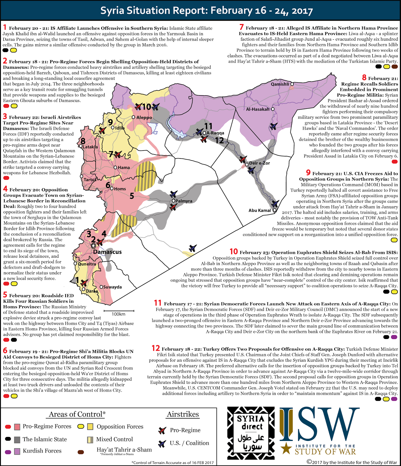 These graphics mark the latest installment of our Syria SITREP Map made possible through a partnership between the Institute for the Study of War and Syria Direct. The graphic depicts significant recent developments in the Syrian Civil War. The control of terrain represented on the graphic is accurate as of February 16, 2017.
