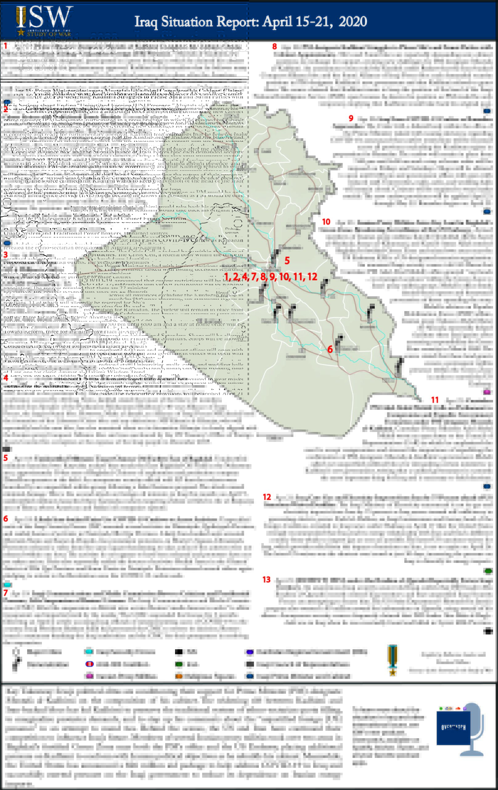 Key Takeaway: Iraq’s political elites are conditioning their support for Prime Minister (PM)-designate Mustafa al-Kadhimi on the composition of his cabinet. The widening rift between Kadhimi and Iran-backed blocs has led Kadhimi to preserve the traditional system of ethno-sectarian quota filling, to marginalize protester demands, and to step up his comments about the “unjustified foreign [US] presence” in an attempt to mend ties. Behind the scenes, the US and Iran have continued their competition to influence Iraq’s future. Members of several Iranian proxy militias took over two areas in Baghdad’s fortified Green Zone near both the PM’s office and the US Embassy, placing additional pressure on Kadhimi to conform with Iranian political objectives as he rebuilds his cabinet. Meanwhile, the United States has announced a $26 million aid package to help address COVID-19 in Iraq and successfully exerted pressure on the Iraqi government to reduce its dependence on Iranian energy imports.