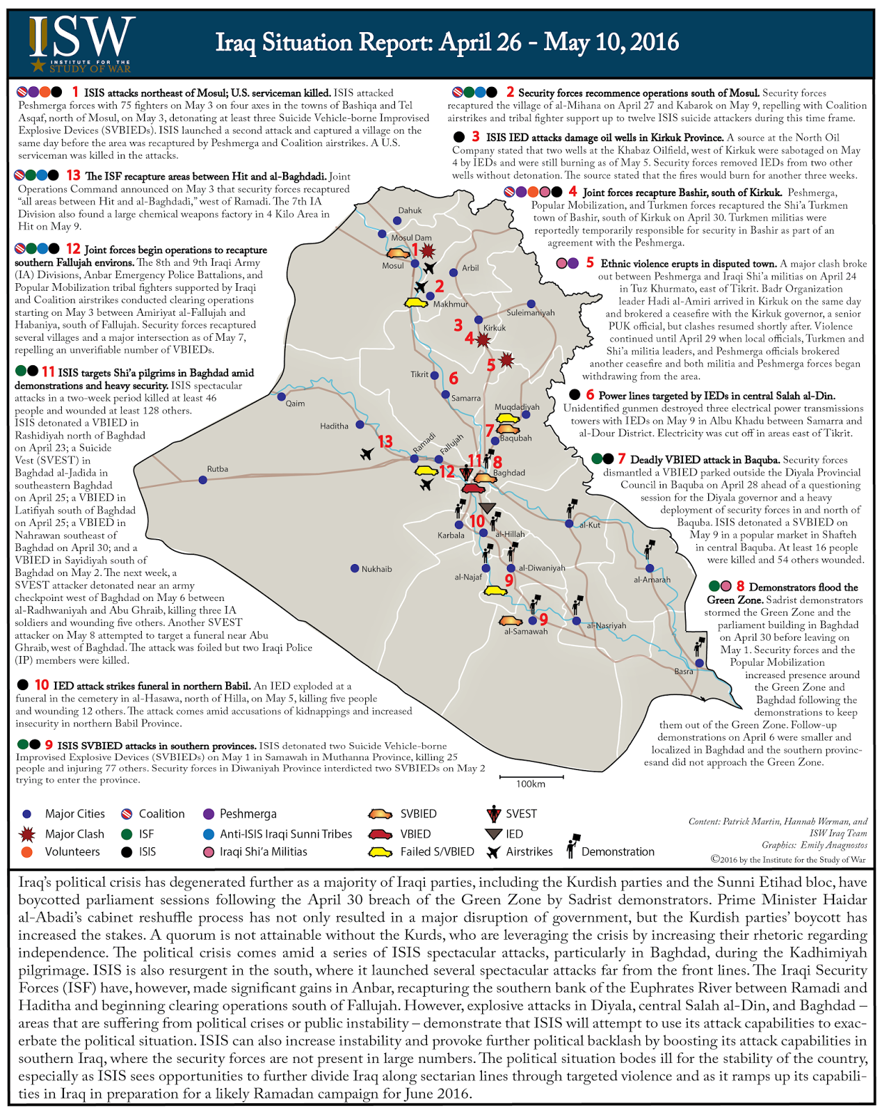 Key Take-Away: Iraq’s political crisis has degenerated further as a majority of Iraqi parties, including the Kurdish parties and the Sunni Etihad bloc, have boycotted parliament sessions following the April 30 breach of the Green Zone by Sadrist demonstrators. Prime Minister Haidar al-Abadi’s cabinet reshuffle process has not only resulted in a major disruption of government, but the Kurdish parties’ boycott has increased the stakes. A quorum is not attainable without the Kurds, who are leveraging the crisis by increasing their rhetoric regarding independence. The political crisis comes amid a series of ISIS spectacular attacks, particularly in Baghdad, during the Kadhimiyah pilgrimage. ISIS is also resurgent in the south, where it launched several spectacular attacks far from the front lines. The Iraqi Security Forces (ISF) have, however, made significant gains in Anbar, recapturing the southern bank of the Euphrates River between Ramadi and Haditha and beginning clearing operations south of Fallujah. However, explosive attacks in Diyala, central Salah al-Din, and Baghdad – areas that are suffering from political crises or public instability – demonstrate that ISIS will attempt to use its attack capabilities to exacerbate the political situation. ISIS can also increase instability and provoke further political backlash by boosting its attack capabilities in southern Iraq, where the security forces are not present in large numbers. The political situation bodes ill for the stability of the country, especially as ISIS sees opportunities to further divide Iraq along sectarian lines through targeted violence and as it ramps up its capabilities in Iraq in preparation for a likely Ramadan campaign for June 2016.