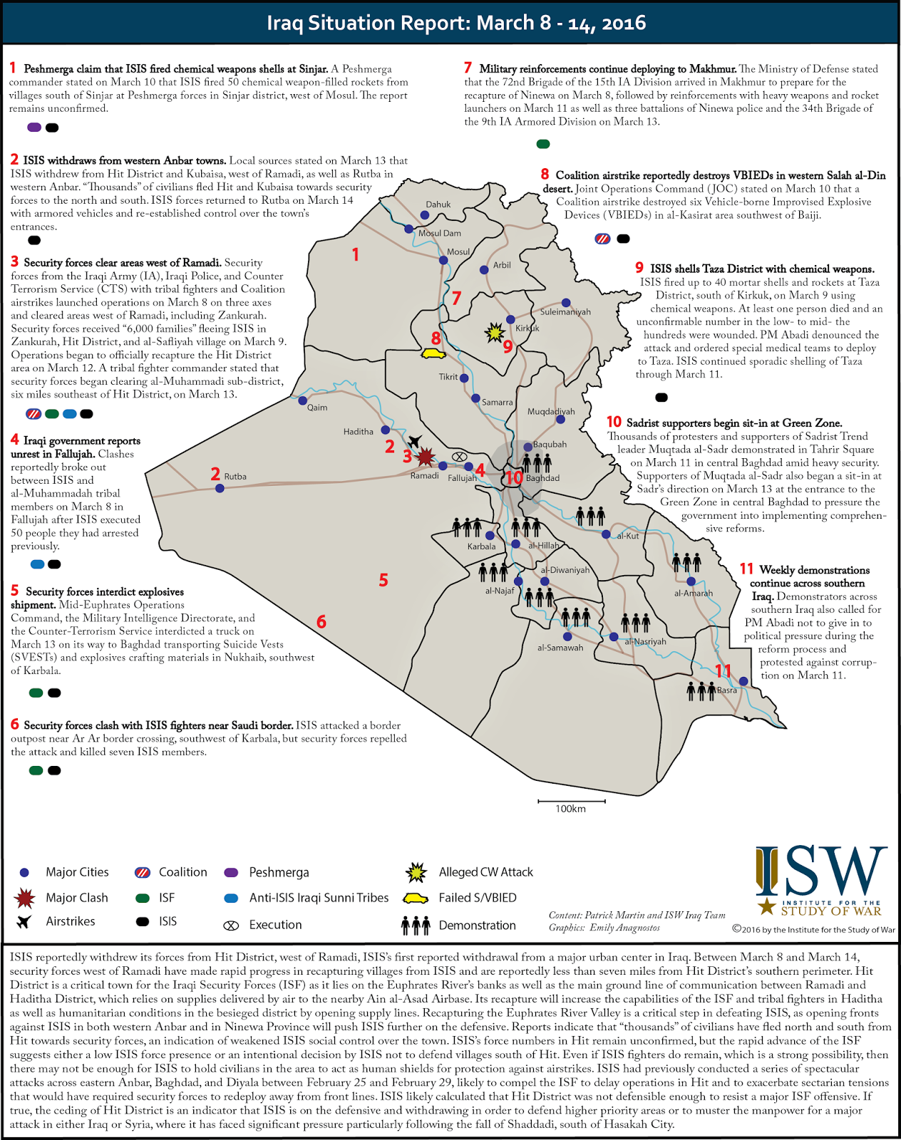 Key take-Away: ISIS reportedly withdrew its forces from Hit District, west of Ramadi, ISIS’s first reported withdrawal from a major urban center in Iraq. Between March 8 and March 14, security forces west of Ramadi have made rapid progress in recapturing villages from ISIS and are reportedly less than seven miles from Hit District’s southern perimeter. Hit District is a critical town for the Iraqi Security Forces (ISF) as it lies on the Euphrates River’s banks as well as the main ground line of communication between Ramadi and Haditha District, which relies on supplies delivered by air to the nearby Ain al-Asad Airbase. Its recapture will increase the capabilities of the ISF and tribal fighters in Haditha as well as humanitarian conditions in the besieged district by opening supply lines. Recapturing the Euphrates River Valley is a critical step in defeating ISIS, as opening fronts against ISIS in both western Anbar and in Ninewa Province will push ISIS further on the defensive. Reports indicate that “thousands” of civilians have fled north and south from Hit towards security forces, an indication of weakened ISIS social control over the town. ISIS’s force numbers in Hit remain unconfirmed, but the rapid advance of the ISF suggests either a low ISIS force presence or an intentional decision by ISIS not to defend villages south of Hit. Even if ISIS fighters do remain, which is a strong possibility, then there may not be enough for ISIS to hold civilians in the area to act as human shields for protection against airstrikes. ISIS had previously conducted a series of spectacular attacks across eastern Anbar, Baghdad, and Diyala between February 25 and February 29, likely to compel the ISF to delay operations in Hit and to exacerbate sectarian tensions that would have required security forces to redeploy away from front lines. ISIS likely calculated that Hit District was not defensible enough to resist a major ISF offensive. If true, the ceding of Hit District is an indicator that ISIS is on the defensive and withdrawing in order to defend higher priority areas or to muster the manpower for a major attack in either Iraq or Syria, where it has faced significant pressure particularly following the fall of Shaddadi, south of Hasakah City.