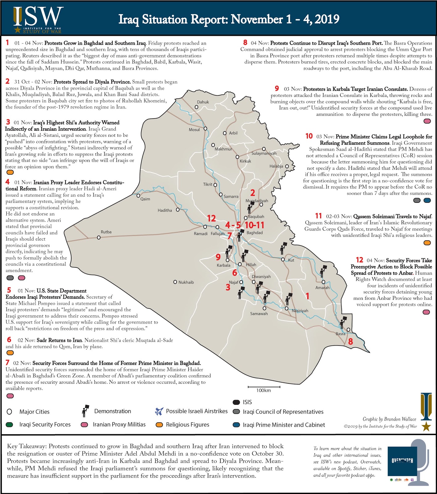 The Institute for the Study of War (ISW) is assessing the ongoing unrest and its effects on political-security dynamics in Iraq. The Iraq Situation Report (SITREP) series summarizes key events and likely developments to come. This SITREP update covers the period November 1-4, 2019.