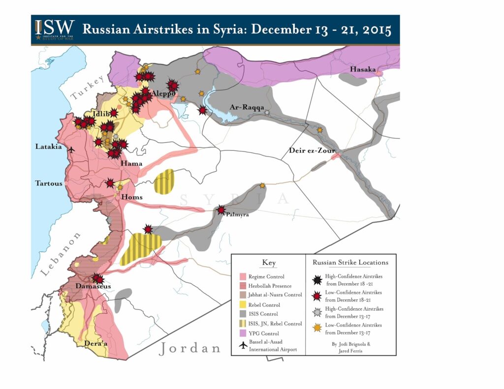 Russia continues to use its air campaign in Syria to bolster the position of Syrian President Bashar al-Assad despite an ongoing political process to end the Syrian Civil War. Russian warplanes concentrated airstrikes against rebel positions southwest of Aleppo City from December 18 to December 21, enabling pro-regime forces to seize the key town of Khan Touman and several nearby villages on December 20. Russian airstrikes later shifted to target rebel forces along the strategic M5 Highway to Aleppo City in likely preparation for future offensive operations. Russia also continued to indiscriminately target rebel-held terrain throughout Northwestern Syria and Damascus in an effort to bolster ongoing regime offensives and weaken the resolve of the opposition. Russia conducted only a limited number of airstrikes against ISIS targets in Aleppo and Homs Provinces over the reporting period.