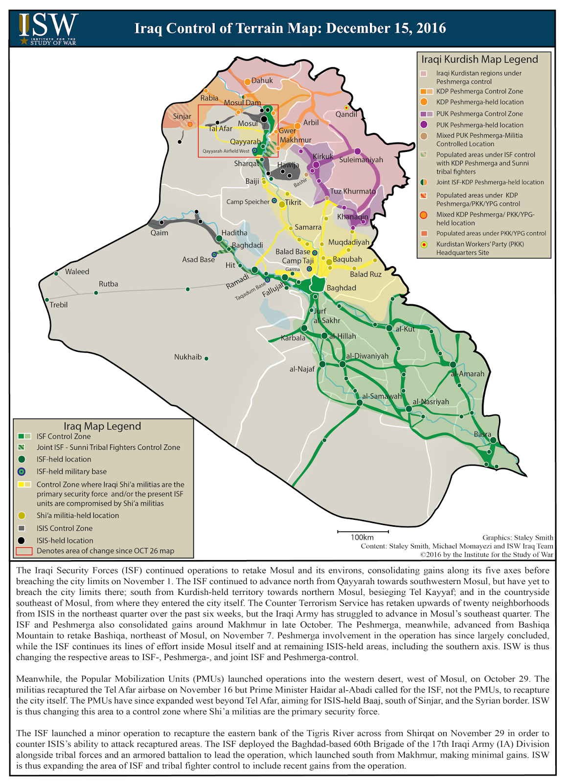 Meanwhile, the Popular Mobilization Units (PMUs) launched operations into the western desert, west of Mosul, on October 29. The militias recaptured the Tel Afar airbase on November 16 but Prime Minister Haidar al-Abadi called for the ISF, not the PMUs, to recapture the city itself. The PMUs have since expanded west beyond Tel Afar, aiming for ISIS-held Baaj, south of Sinjar, and the Syrian border. ISW is thus changing this area to a control zone where Shi’a militias are the primary security force.