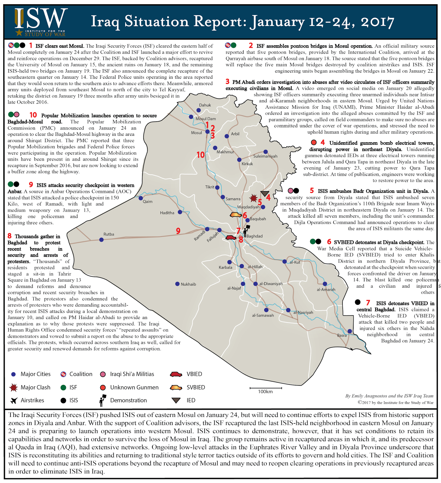 The Iraqi Security Forces (ISF) pushed ISIS out of eastern Mosul on January 24, but will need to continue efforts to expel ISIS from historic support zones in Diyala and Anbar. With the support of Coalition advisors, the ISF recaptured the last ISIS-held neighborhood in eastern Mosul on January 24 and is preparing to launch operations into western Mosul. ISIS continues to demonstrate, however, that it has set conditions to retain its capabilities and networks in order to survive the loss of Mosul in Iraq. The group remains active in recaptured areas in which it, and its predecessor al Qaeda in Iraq (AQI), had extensive networks. Ongoing low-level attacks in the Euphrates River Valley and in Diyala Province underscore that ISIS is reconstituting its abilities and returning to traditional style terror tactics outside of its efforts to govern and hold cities. The ISF and Coalition will need to continue anti-ISIS operations beyond the recapture of Mosul and may need to reopen clearing operations in previously recaptured areas in order to eliminate ISIS in Iraq.