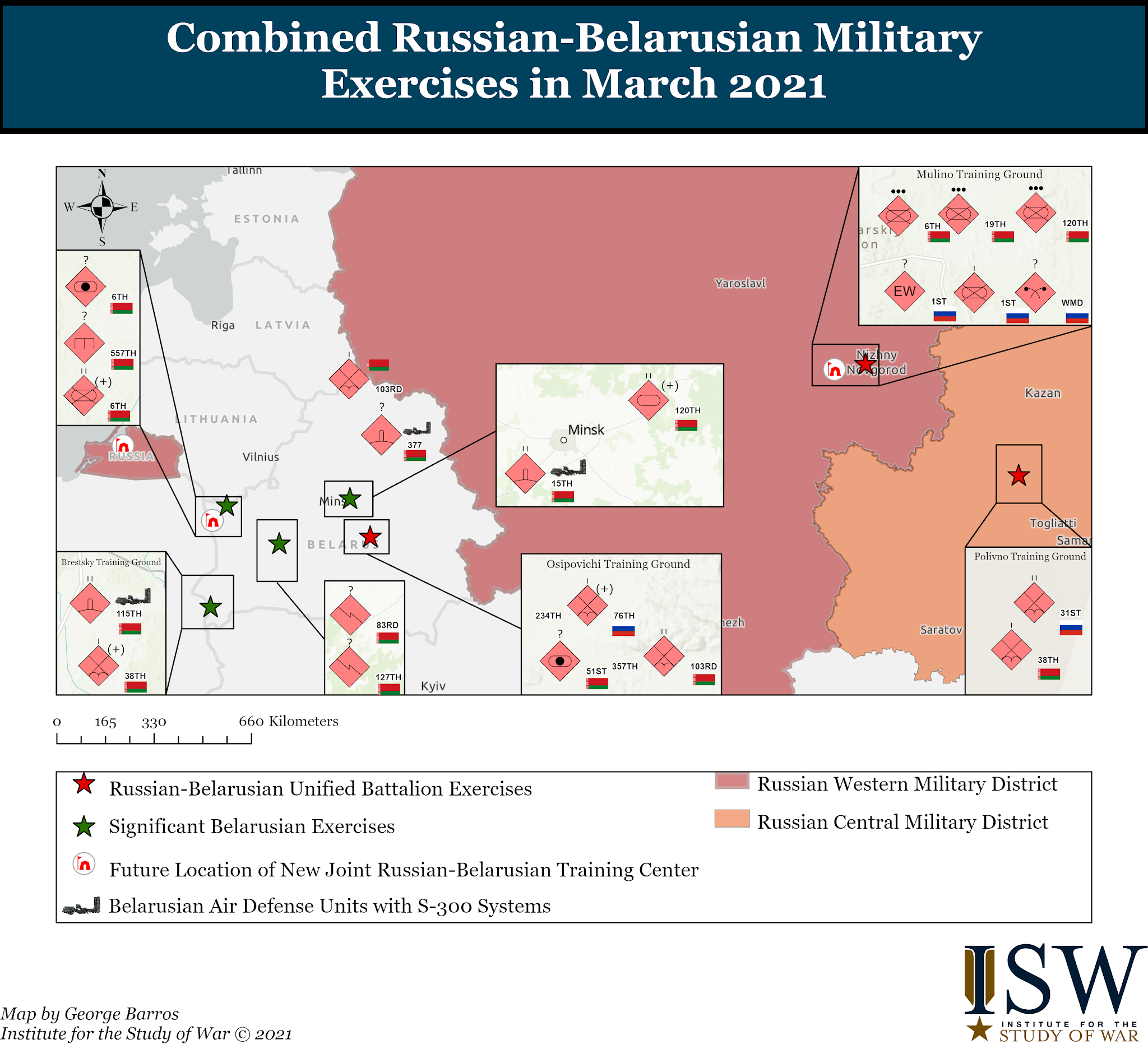 [12] George Barros, “Belarus Warning Update: Russia Deploys a Third Battalion Tactical Group to Belarus,” Institute for the Study of War, September 22, 2020, https://understandingwar.org/backgrounder/belarus-warning-update-russia-deploys-third-battalion-tactical-group-belarus; George Barros, “Warning: The Kremlin Deploys a Brigade-Sized Force to Belarus Near Polish Border,” Institute for the Study of War, September 21, 2020, https://understandingwar.org/backgrounder/warning-kremlin-deploys-brigade-sized-force-belarus-near-polish-border; George Barros, “Belarus Warning Update: Multiple Russian Military Exercises Occurring in the Western Military District, Belarus, and Moldova,” Institute for the Study of War, September 19, 2020, https://understandingwar.org/backgrounder/belarus-warning-update-multiple-russian-military-exercises-occurring-western-military; George Barros, “Belarus Warning Update: Upcoming CSTO Exercise Could Support Russian Military Deployment to Belarus,” Institute for the Study of War, November 6, 2020, https://understandingwar.org/backgrounder/belarus-warning-update-upcoming-csto-exercise-could-support-russian-military-deployment; George Barros and Mason Clark, “Belarus Warning Update: The Kremlin Will Likely Use October Military Exercises to Advance its Hybrid War in Belarus,” Institute for the Study of War, October 8, 2020, https://understandingwar.org/2020/10/belarus-warning-update-kremlin-will.html.