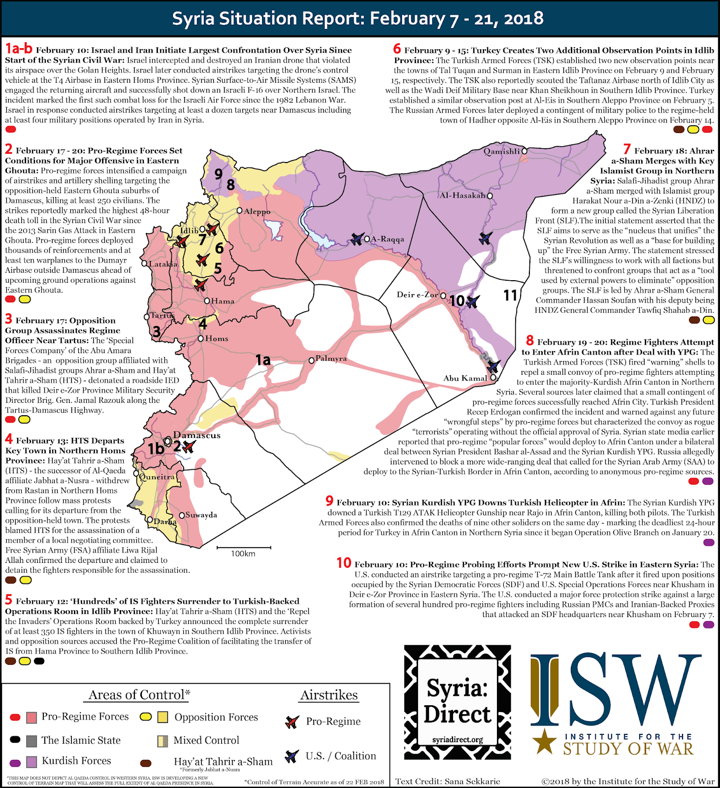 This series of graphics marks the latest installment of our Syria SITREP Map made possible through a partnership between the Institute for the Study of War and Syria Direct. These graphics depict significant developments in the Syrian Civil War from February 7 – 21, 2018. The control of terrain represented on the graphics is accurate as of February 22, 2018.