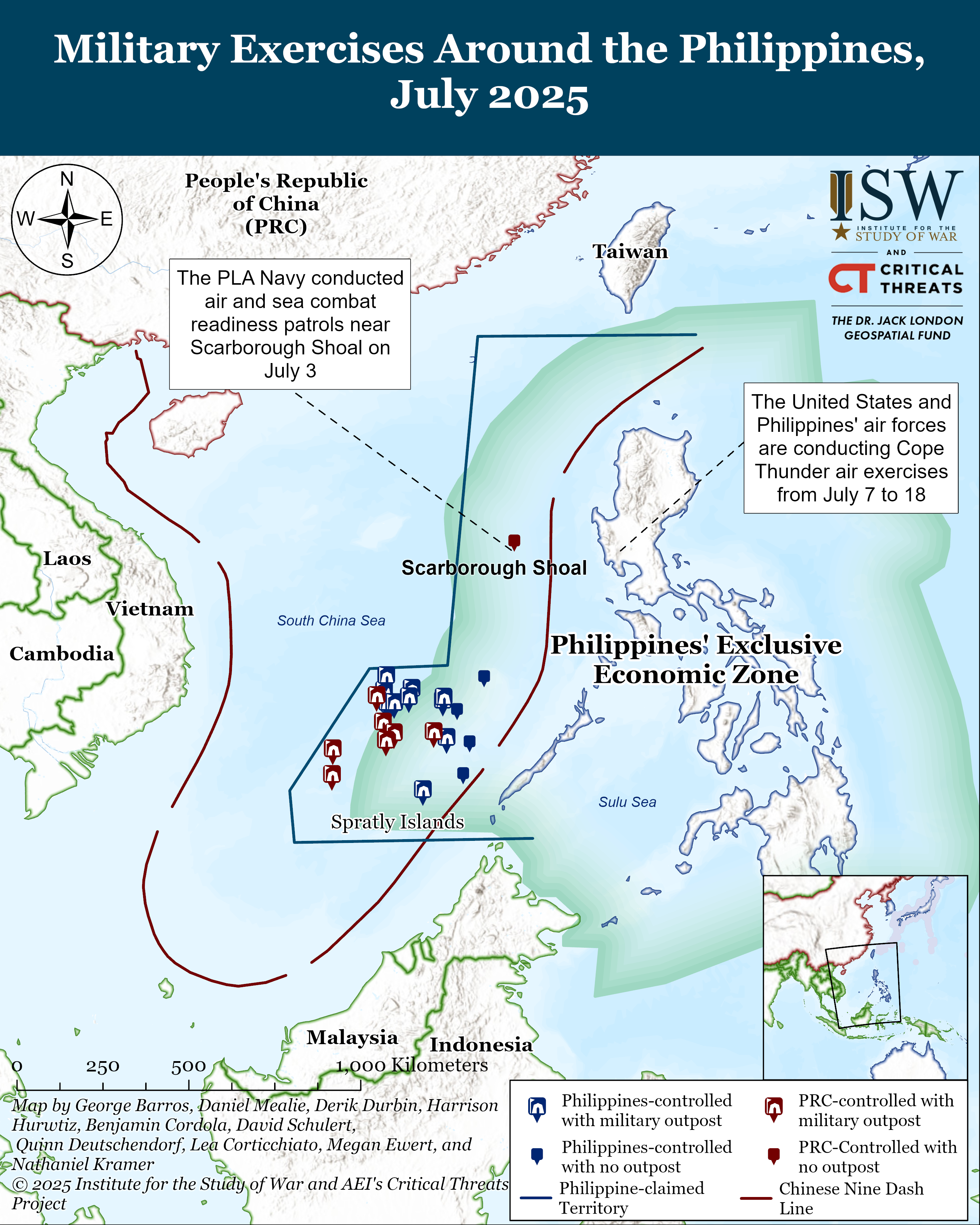 The People’s Liberation Army Southern Theater Command (PLA STC) conducted combat-readiness patrols around Scarborough Shoal on July 3. The Philippines and the United States will conduct the Cope Thunder combined air exercises from July 7 to 18. The PLA STC issued a press statement and video on state media stating that it conducted air and sea combat readiness patrols “in the territorial waters and airspace of China’s Huangyan Island (Scarborough Shoal) and surrounding areas.”[56] It also stated that PLA naval and air forces have been conducting patrols around Scarborough Shoal since June to strengthen the PRC’s territorial claim and assert control over the area. The video footage and subsequent reporting from PRC media the Global Times showed the Type 054 frigate, Type 056A corvette, J-16 fighter jet, and H-6K bomber equipped with YJ-12 supersonic anti-ship missiles.[57] The Scarborough Shoal, which the PRC calls Huangyan Island, is an uninhabited atoll that the Philippines, PRC, and Taiwan all claim. The PRC has been working to normalize activities in the South China Sea and has maintained a steady presence around Scarborough Shoal since 2012.[58] Philippine Coast Guard Commodore Jay Tarriela stated that Manila has adopted a “transparency strategy” to speak out against PRC efforts to assert territorial claims in the South China Sea.[59] Tarriela contrasted the Philippines’ approach with other Southeast Asian states, who he claims “ignore” PRC aggressions. The Philippines has maintained a strong stance against PRC aggression and the ongoing Cope Thunder exercises between the Philippines and the United States in the South China Sea from July 7 to July 18 are in response to PRC aggression.[60] This is the second iteration of the Cope Thunder exercises, with the first occurring in 2024.[61]