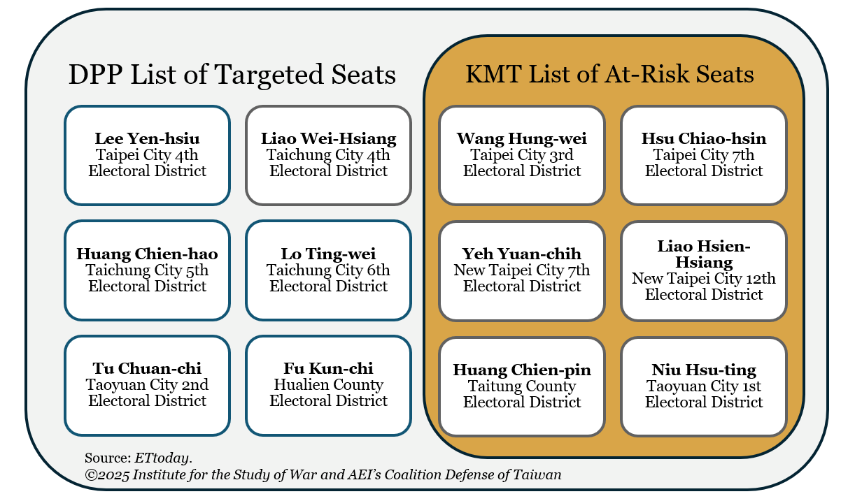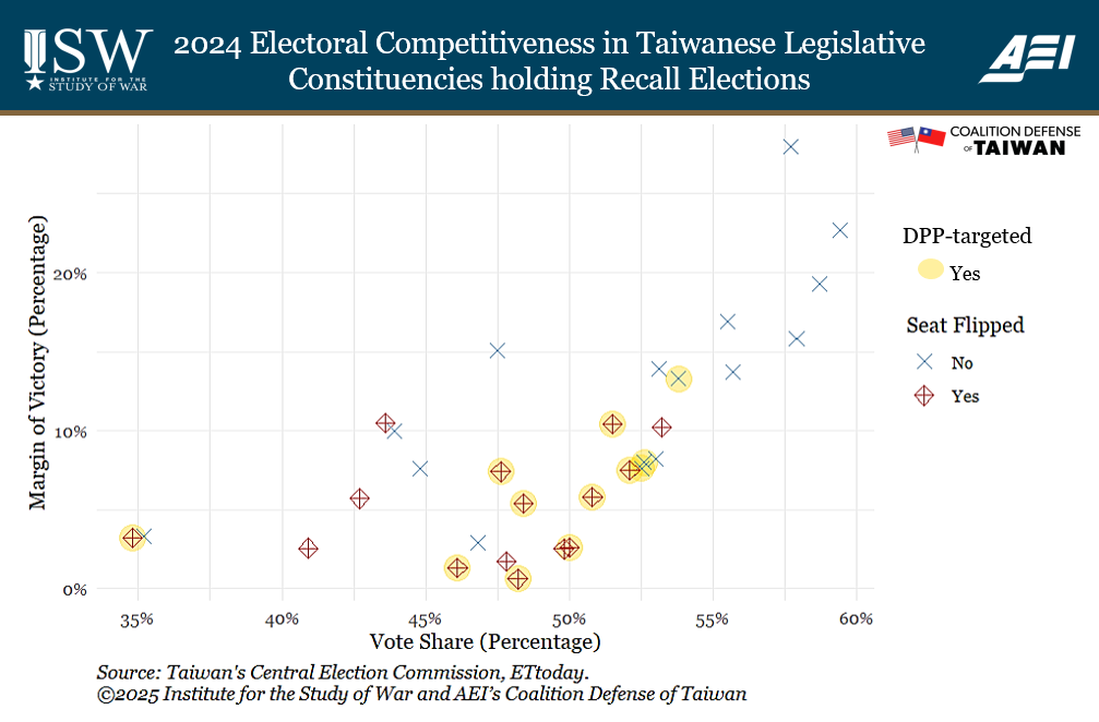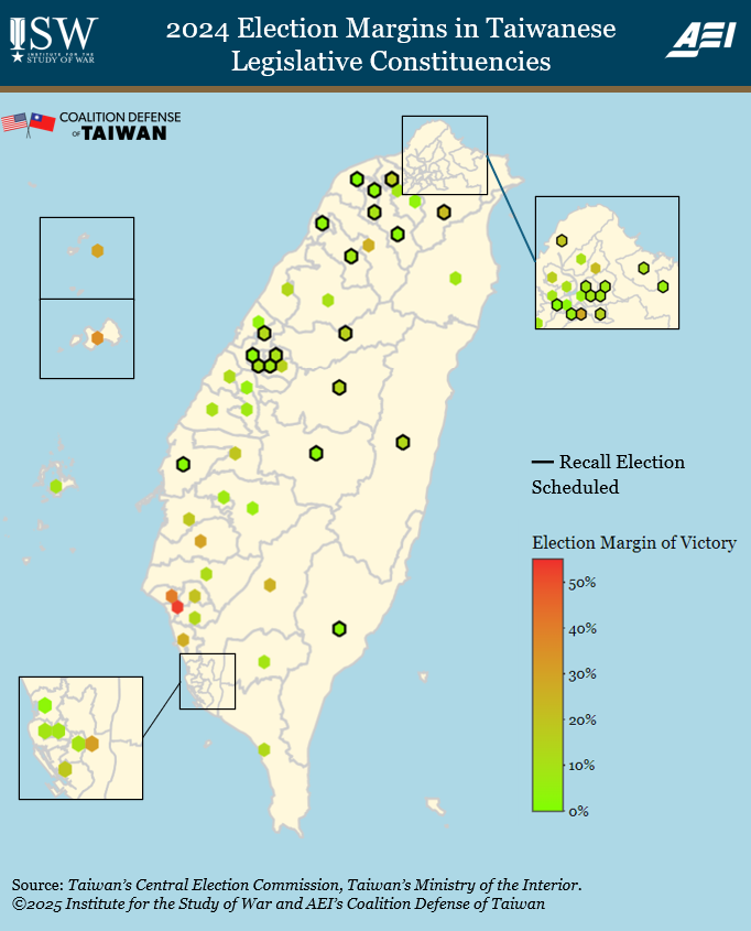Taiwanese media outlet ETtoday published that the DPP is focusing on recall votes in 12 districts. The KMT has identified six of these seats as being at particular risk.[2] These districts are more competitive, even compared to the other districts that are holding recall votes. The average victory margin across the 12 districts was 6.1 percent. Nine of the 12 seats were flipped in the 2024 legislative elections. Only 17 out of 73 single-member constituencies were flipped in the 2024 LY election. These recall votes are thus functioning as unofficial midterm elections, threatening to dislodge the KMT from recently won ground.
