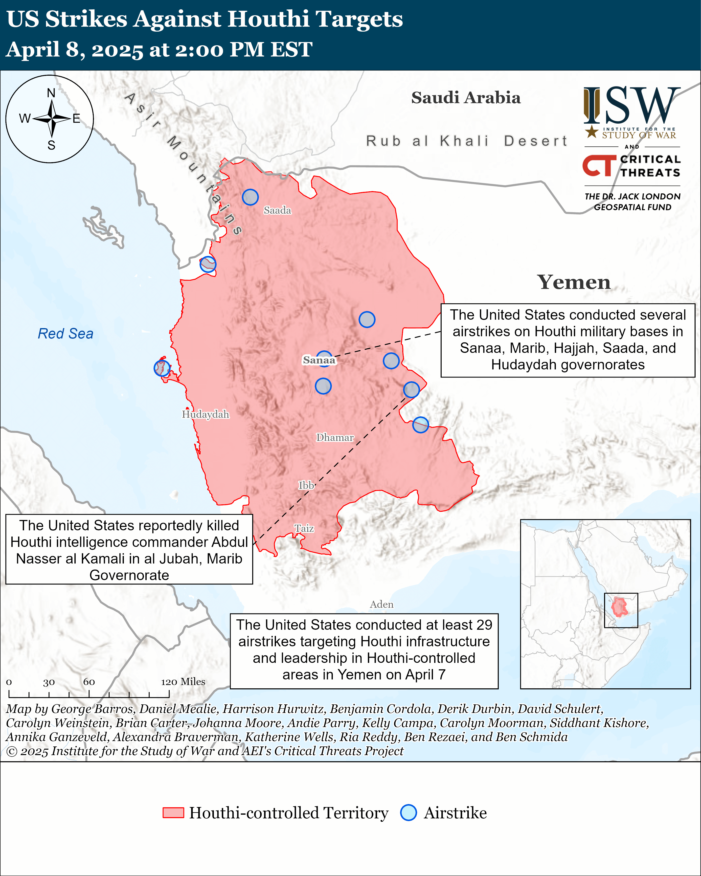 US Central Command (CENTCOM) conducted at least 29 airstrikes targeting Houthi infrastructure and leadership in Houthi-controlled areas of Yemen on April 7.[73] CENTCOM conducted at least 9 airstrikes targeting three separate reported Houthi military bases in Marib Governorate on the eastern front of Houthi-controlled areas of Yemen.[74] CENTCOM also launched at least 11 airstrikes targeting two separate Houthi sites in Sanaa Governorate.[75] CENTCOM conducted at least two airstrikes on a Houthis weapons depot on Kamaran Island, Hudaydah Governorate, for a third consecutive day.[76] CENTCOM reportedly killed Houthi intelligence official Abdulnaser al Kamali in a targeted airstrike on a vehicle near a Houthi command and control center in southern al Jubah, Marib Governorate.[77]