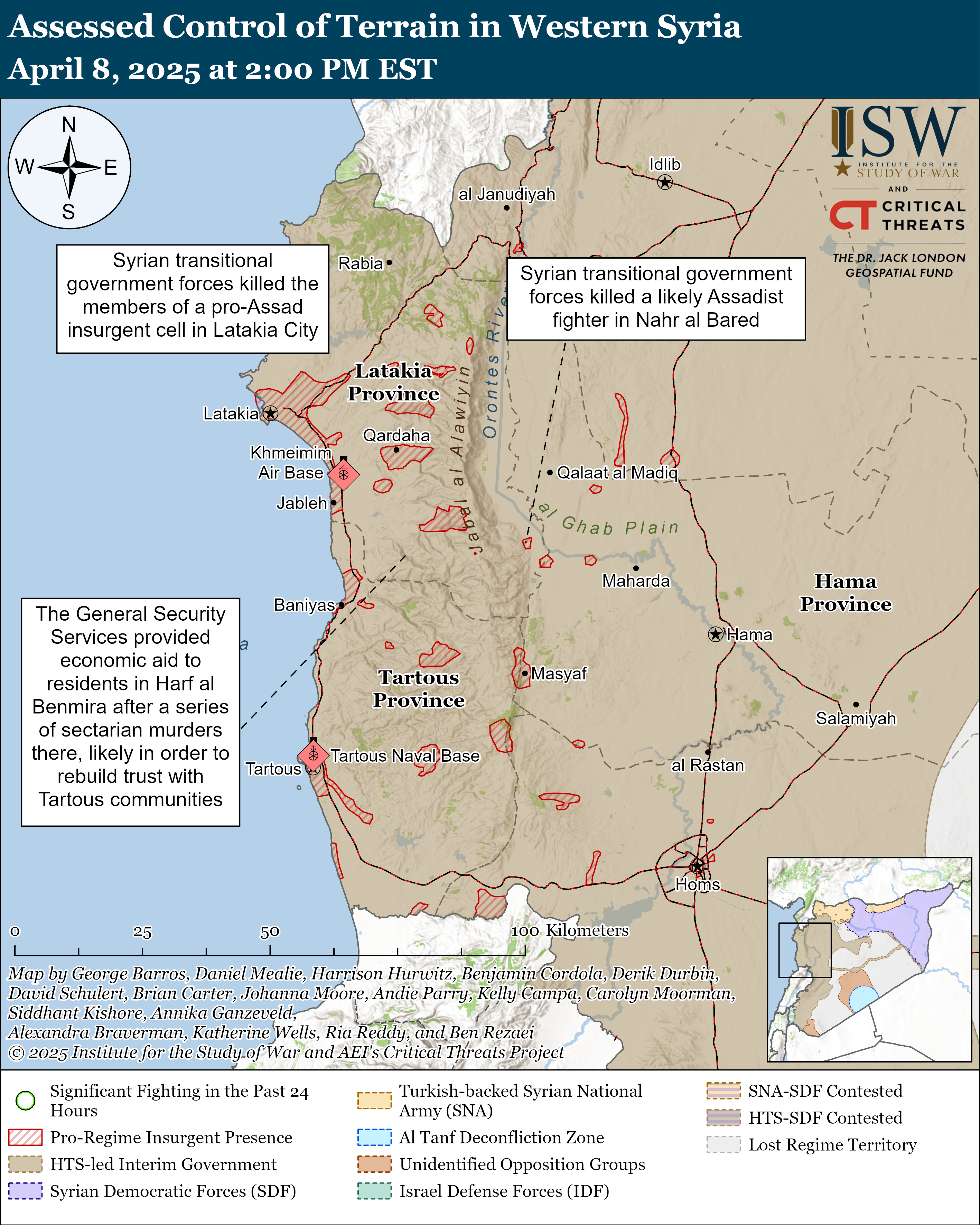 Syrian transitional government forces provided economic aid to residents in Harf al Benmira, Tartous Province, after a series of murders as part of a government program likely intended to rebuild trust with coastal communities. Photos posted on social media on April 7 showed members of Baniyas’ General Security Services, including the director, handing out bundles of cash to residents in Harf al Benmira.[50] The effort is part of a Syrian Civil Peace Committee program that follows a recent incident in which Syrian soldiers killed six men in the town on March 31.[51] Syrian Transitional President Ahmed al Shara created the Syrian Civil Peace Committee after the spate of sectarian violence on the Syrian coast in early March.[52] The assistance program in Harf al Benmira is consistent with official government attempts in Tartous to reconcile with local communities. The Tartous provincial government recently distributed a financial grant among 2,000 families in Tartous that were impacted by insurgent attacks or government counter-insurgency tactics.[53] The Syrian government must rebuild trust within Alawite communities after numerous recent bouts of violence that have targeted Alawites. It is also important that the government address the Alawites’ economic grievances in order to confront the root causes of the pro-Assad insurgent campaign. Limited financial grants will not be enough to address these long-standing grievances, however. A Lebanese newspaper reported that the government in Tartous only provided $100 to each of the families impacted by the March 6 and 7 attacks.[54]