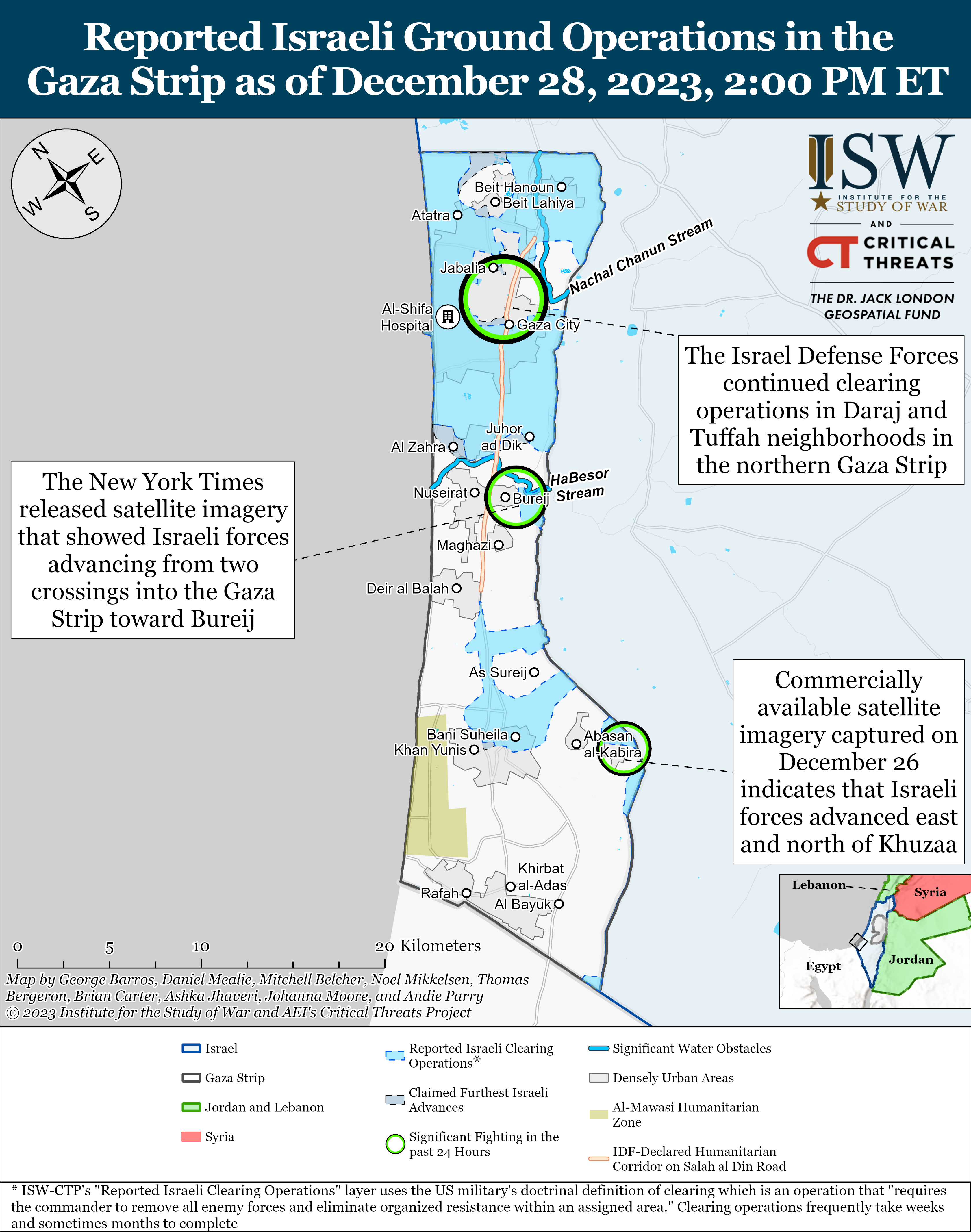 Note: CTP and ISW have refocused the update to cover the Israel-Hamas war. The new sections address developments in the Gaza Strip, the West Bank, Lebanon, and Syria, as well as noteworthy activity from Iran’s Axis of Resistance. We do not report in detail on war crimes because these activities are well-covered in Western media and do not directly affect the military operations we are assessing and forecasting. We utterly condemn violations of the laws of armed conflict and the Geneva Conventions and crimes against humanity even though we do not describe them in these reports.