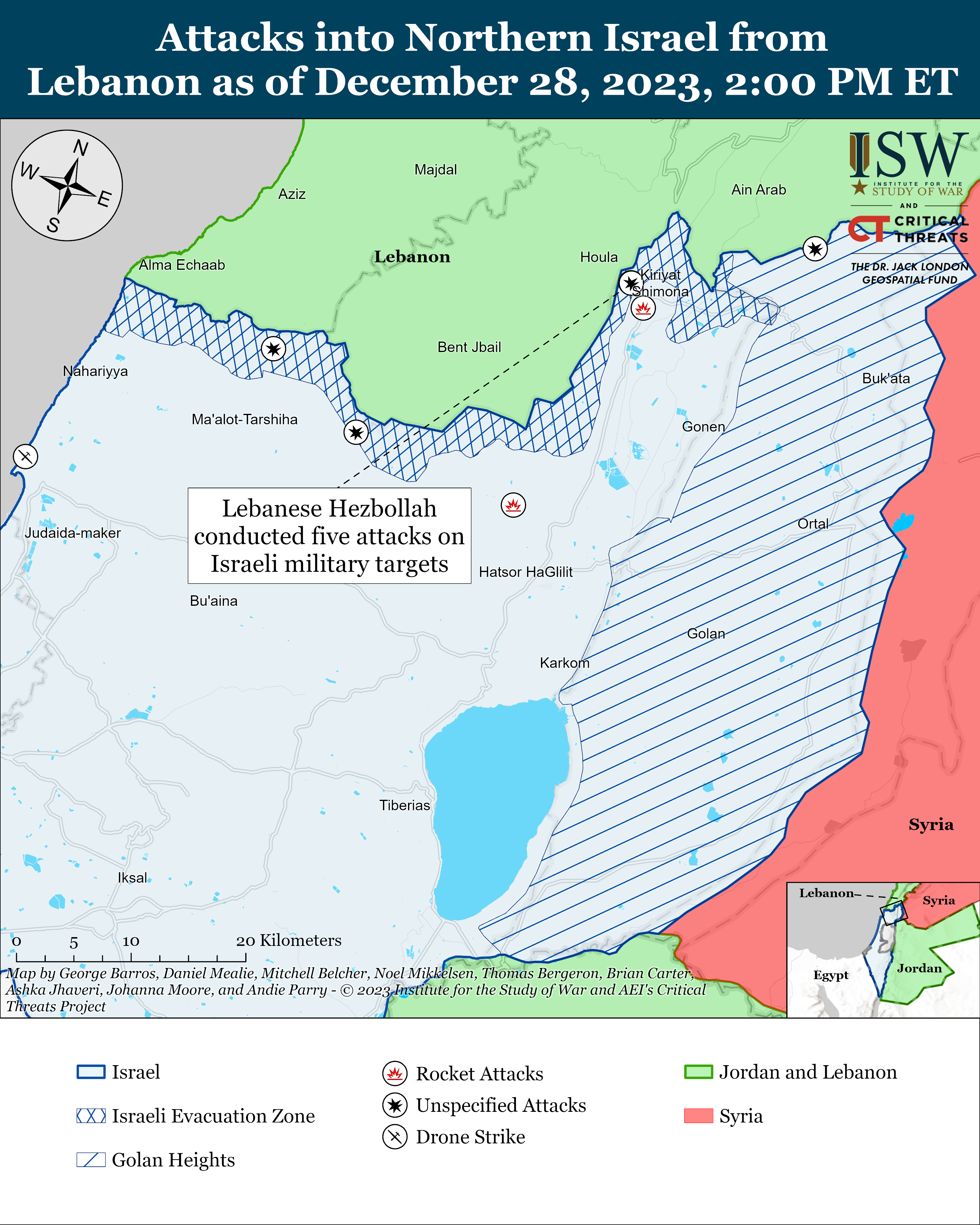 Iranian-backed fighters, including Lebanese Hezbollah (LH), conducted eight attacks from southern Lebanon into northern Israel on December 28.[39] LH claimed five attacks targeting Israeli military facilities along the border.[40] Unidentified Iranian-backed fighters fired over 50 rockets into the Galilee region.[41] Palestinian media posted footage claiming that a drone was shot down near Acre, north of Haifa.[42] Israeli air defense systems last intercepted a “suspicious target“ over Acre on November 14.[43]