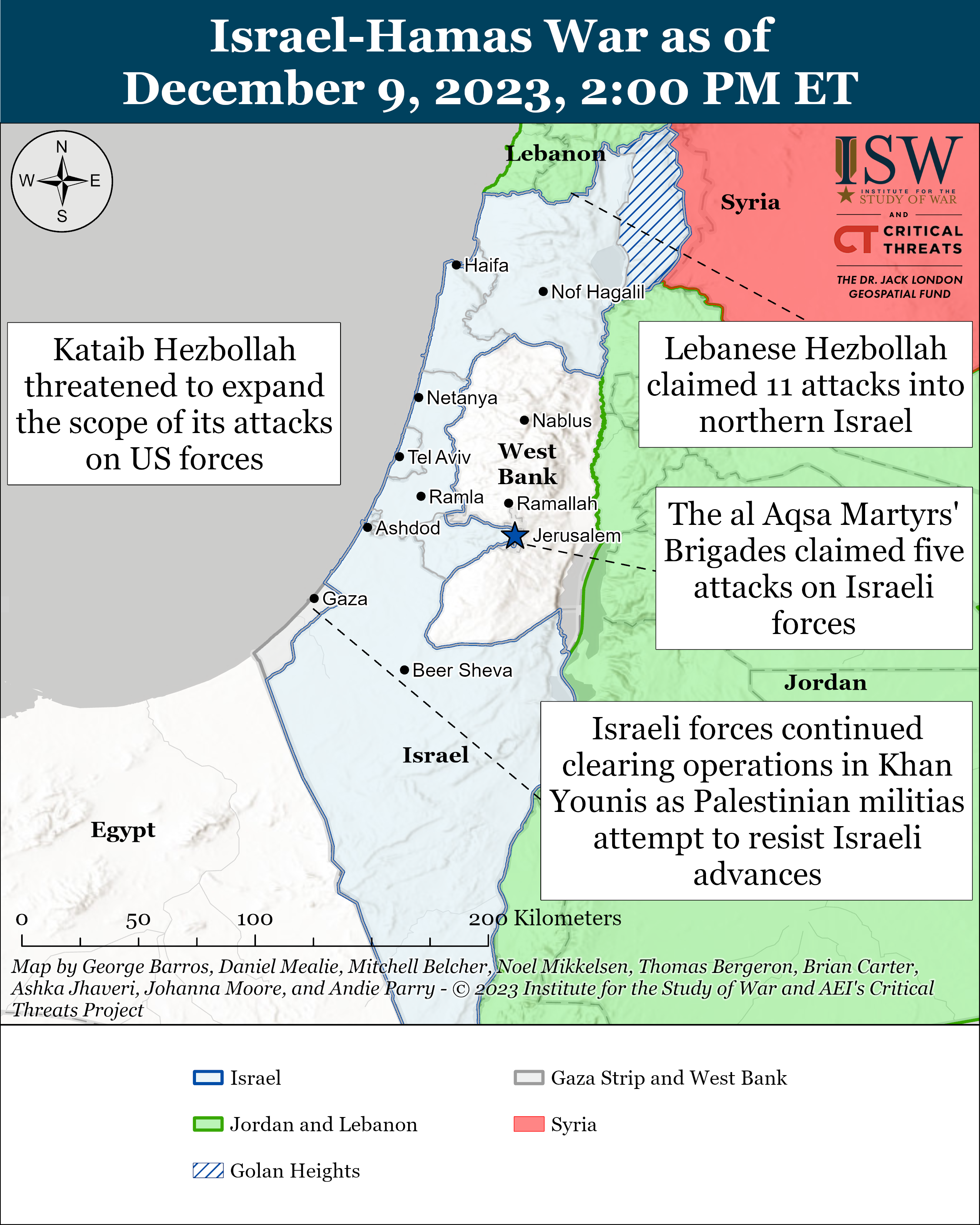 Note: CTP and ISW have refocused the update to cover the Israel-Hamas war. The new sections address developments in the Gaza Strip, the West Bank, Lebanon, and Syria, as well as noteworthy activity from Iran’s Axis of Resistance. We do not report in detail on war crimes because these activities are well-covered in Western media and do not directly affect the military operations we are assessing and forecasting. We utterly condemn violations of the laws of armed conflict and the Geneva Conventions and crimes against humanity even though we do not describe them in these reports.