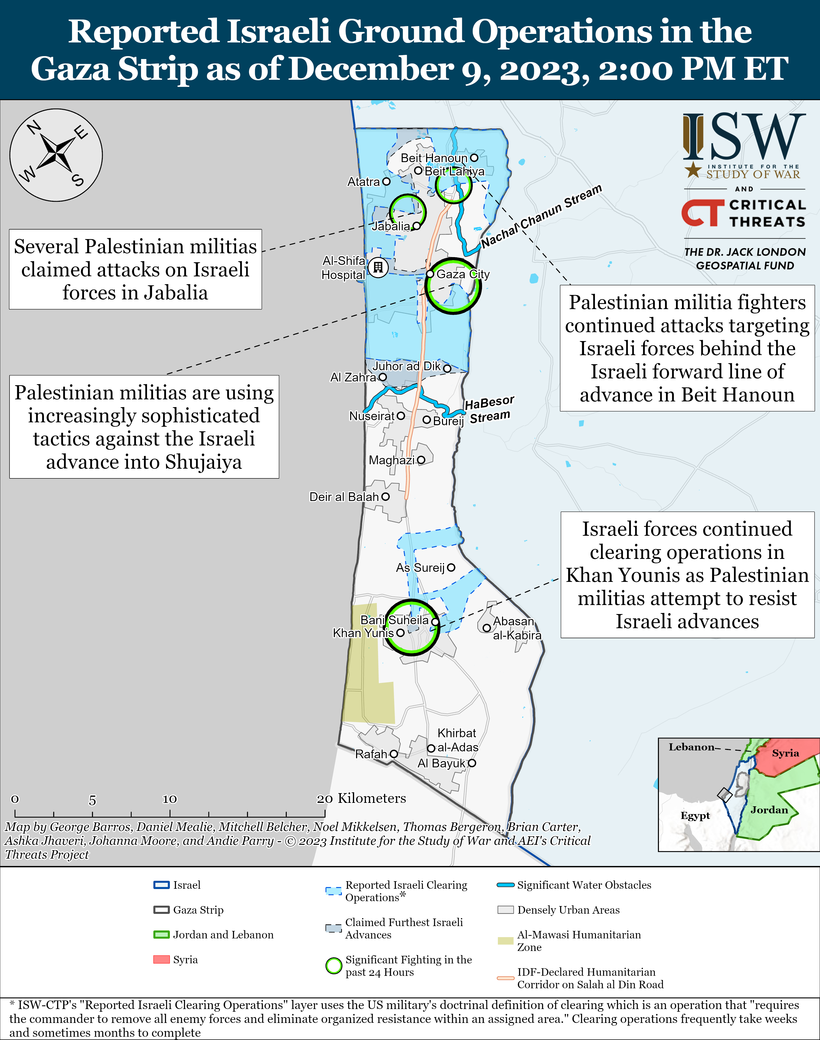 Palestinian militia fighters are continuing their attacks against the IDF behind the Israeli forward line of advance, which is consistent with the nature of clearing operations. Palestinian militia fighters fired at Israeli forces from civilian infrastructure in Beit Hanoun.[25] The al Quds Brigades claimed to fire RPGs at two military vehicles in Beit Hanoun on December 9.[26] Fighting behind the Israeli forward line of advance is consistent with the doctrinal definition of “clear,” which is a tactical task that “requires the commander to remove all enemy forces and eliminate organized resistance within an assigned area.”