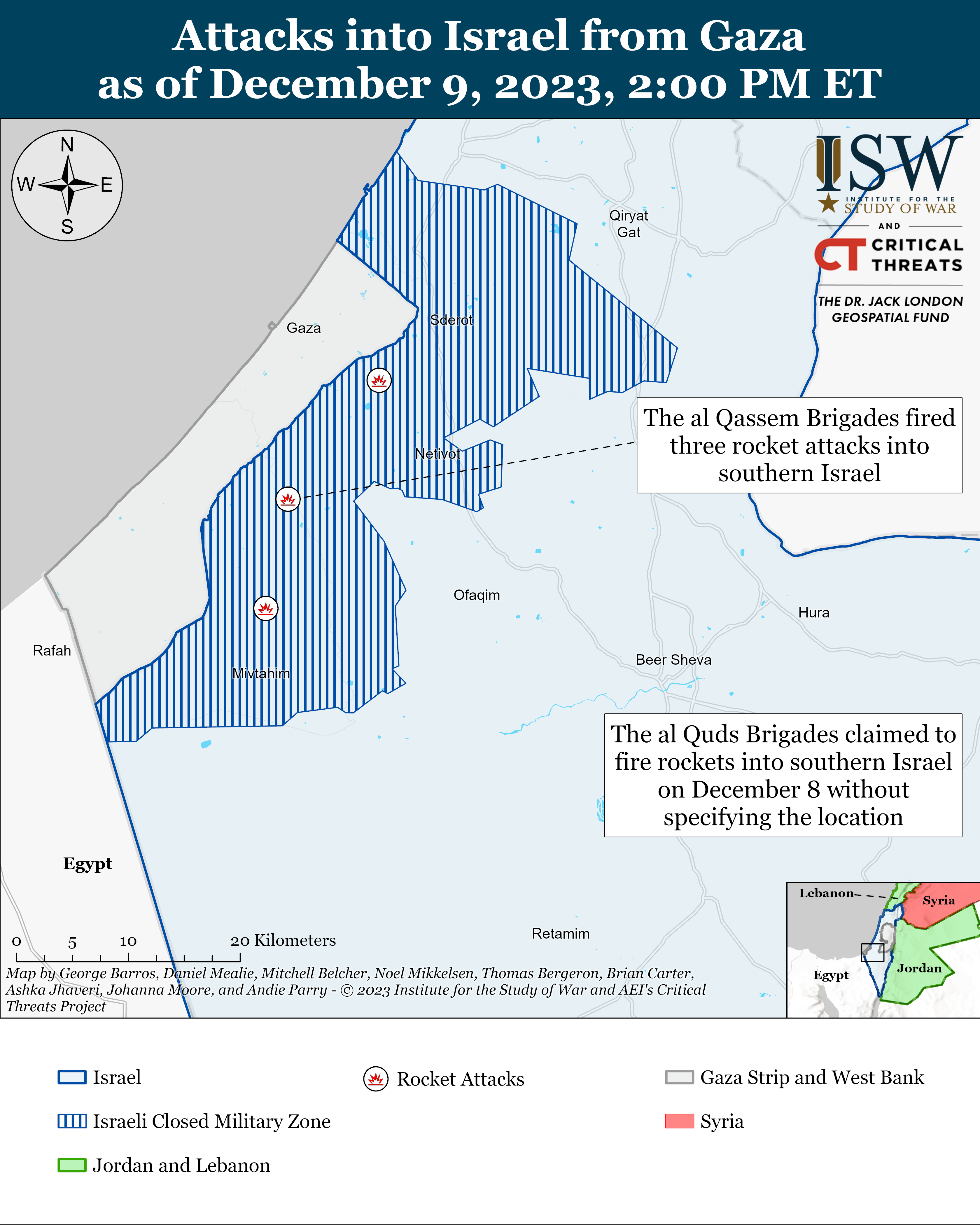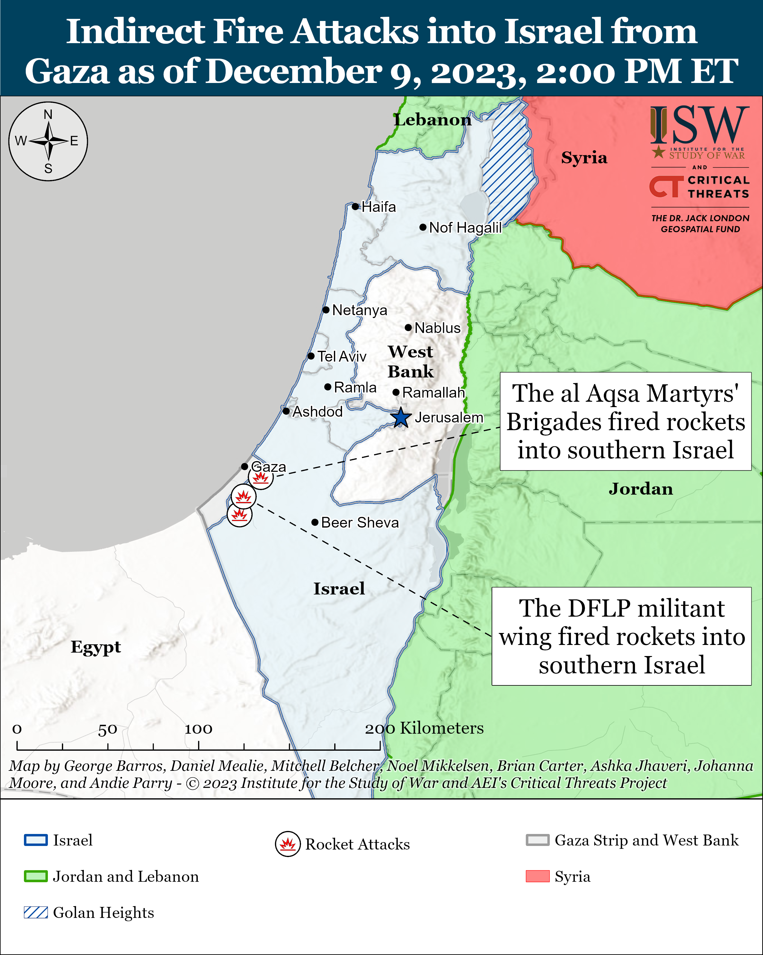 Palestinian militias conducted at least five indirect fire attacks from the Gaza Strip into Israeli territory. The al Quds Brigades claimed on December 8 to fire rockets at Israeli towns in southern Israel without specifying the locations.[30] The al Qassem Brigades conducted three rocket attacks into southern Israel.[31] The al Aqsa Martyrs’ Brigades—the self-proclaimed militant wing of Fatah—conducted a rocket attack on an Israeli town near the Gaza Strip.[32] The National Resistance Brigades—the militant wing of the Democratic Front for the Liberation of Palestine—conducted one rocket attack into southern Israel.[33] An IDF spokesperson reported on December 9 that Hamas has continued to fire rockets from the Israel-declared humanitarian zone west of Khan Younis.[34] The spokesperson referenced two rocket attacks on December 8, which fell short of Israeli territory.[35]