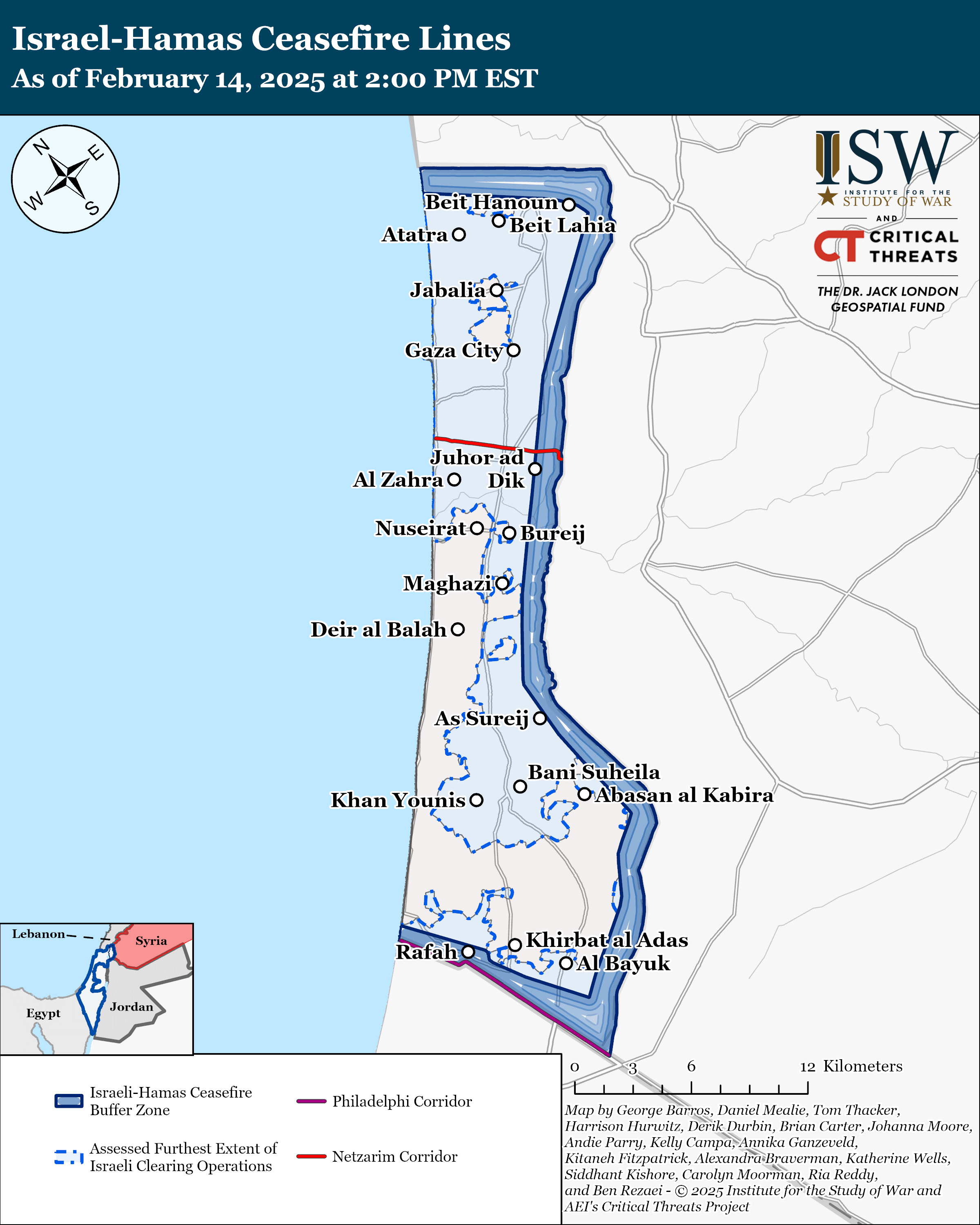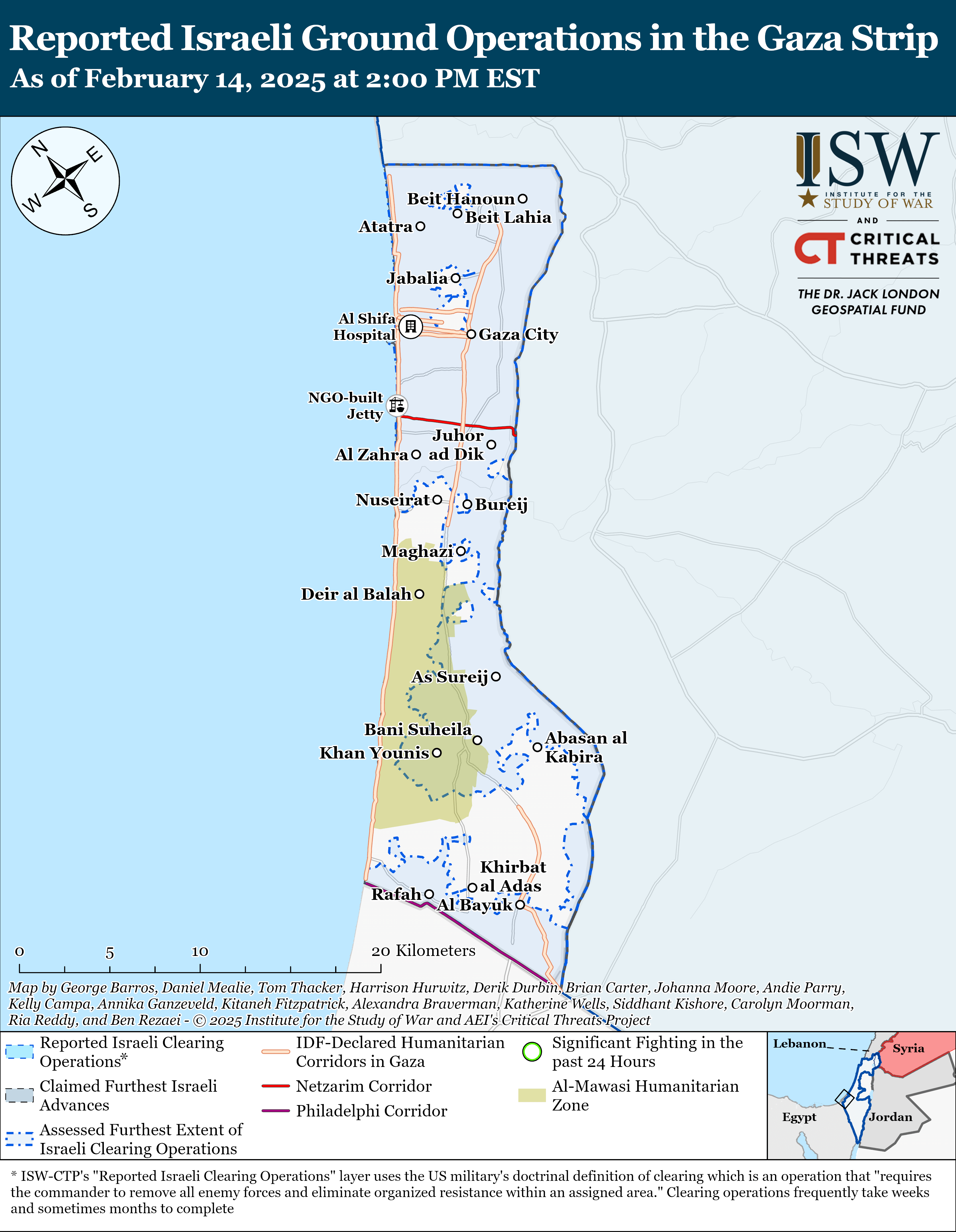 Senior Hamas official Osama Hamdan said on February 14 that negotiations for the second phase of the Israel-Hamas ceasefire-hostage agreement will begin on February 17 if Israel does not delay the delivery of humanitarian aid and heavy equipment to the Gaza Strip.[75] The Israeli government has not yet confirmed that it will send a delegation to the negotiations. Israel and Hamas reached an agreement on February 13, under which the ceasefire’s first phase will continue. Hamas had previously jeopardized the ceasefire by refusing to release more Israeli hostages.[76] Senior Hamas political official Taher al Nono claimed that the Israeli government did not authorize its delegation to negotiate the second phase of the ceasefire during negotiations from February 8 to 9.[77] Hamas had announced it would stop releasing hostages after these negotiations.[78]