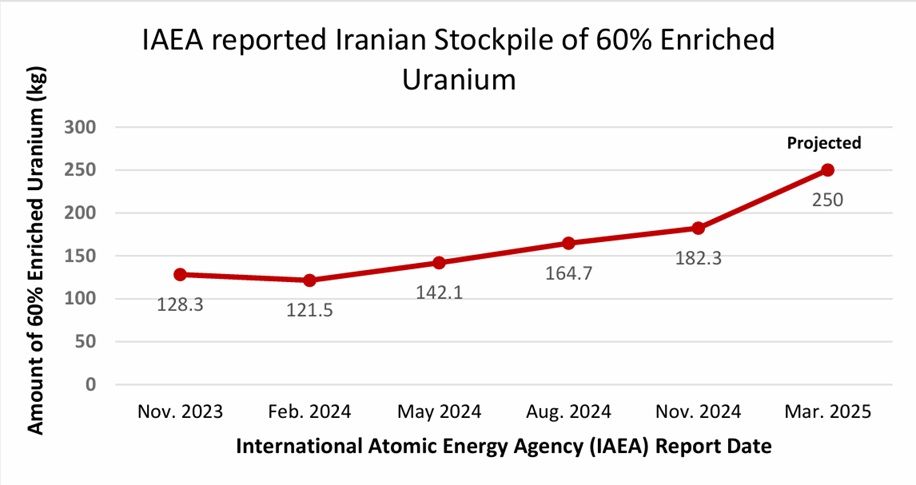International Atomic Energy Agency (IAEA) Director Raphael Grossi stated that Iran will likely have 250kg of uranium enriched up to 60% by the next IAEA report in March 2025. This marks a significant increase in Iran’s stockpile of 60 percent enriched uranium since the IAEA’s last report in November 2024.[18] The IAEA reported in November 2024 that Iran had 182.3 kg of enriched uranium, up to 60 percent.[19] 250 kg of enriched uranium up to 60 percent is equivalent to 6 significant quantities, marking over a 1.5 increase in significant quantities since the IAEA’s last report.[20] The IAEA defines a significant quantity as the “approximate amount of nuclear material for which the possibility of manufacturing a nuclear explosive device cannot be excluded.”[21] Grossi also told Reuters that the IAEA would likely delay issuing a comprehensive report on Iran’s nuclear activities beyond March, when the IAEA initially intended to release the report.[22]