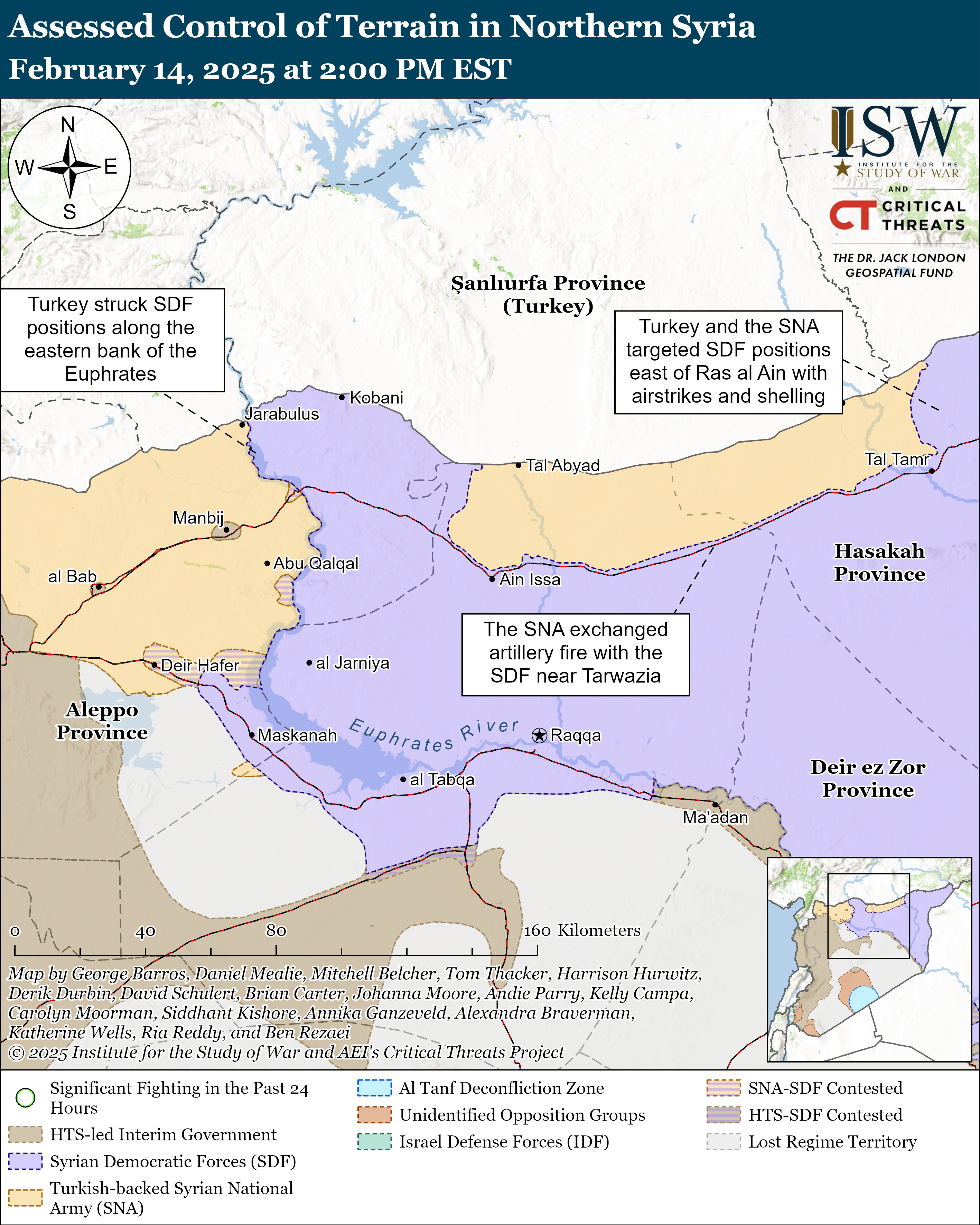 Turkey and the SNA continued to target SDF positions along the Peace Spring frontlines on February 14. Anti-SDF media claimed that the SNA conducted an artillery strike on an SDF position in Abu Rasin.[42] Anti-SDF media also reported that the SNA and SDF exchanged artillery fire north of Raqqa near the M4 highway.[43]
