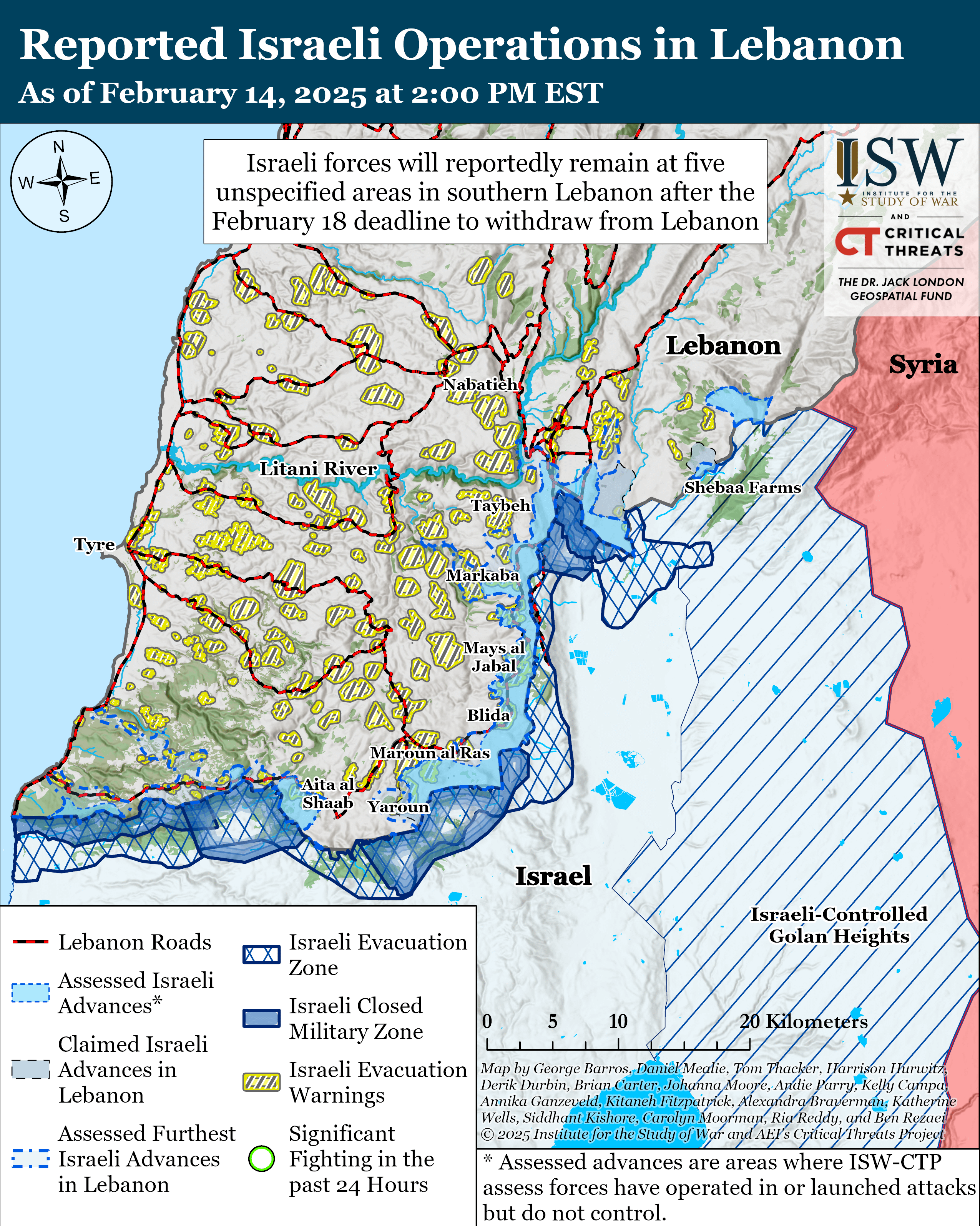 Israeli Army Radio reported on February 14 that Israel intends to extend the deployment of Israeli forces at five unspecified locations in southern Lebanon after the February 18 withdrawal date.[80]