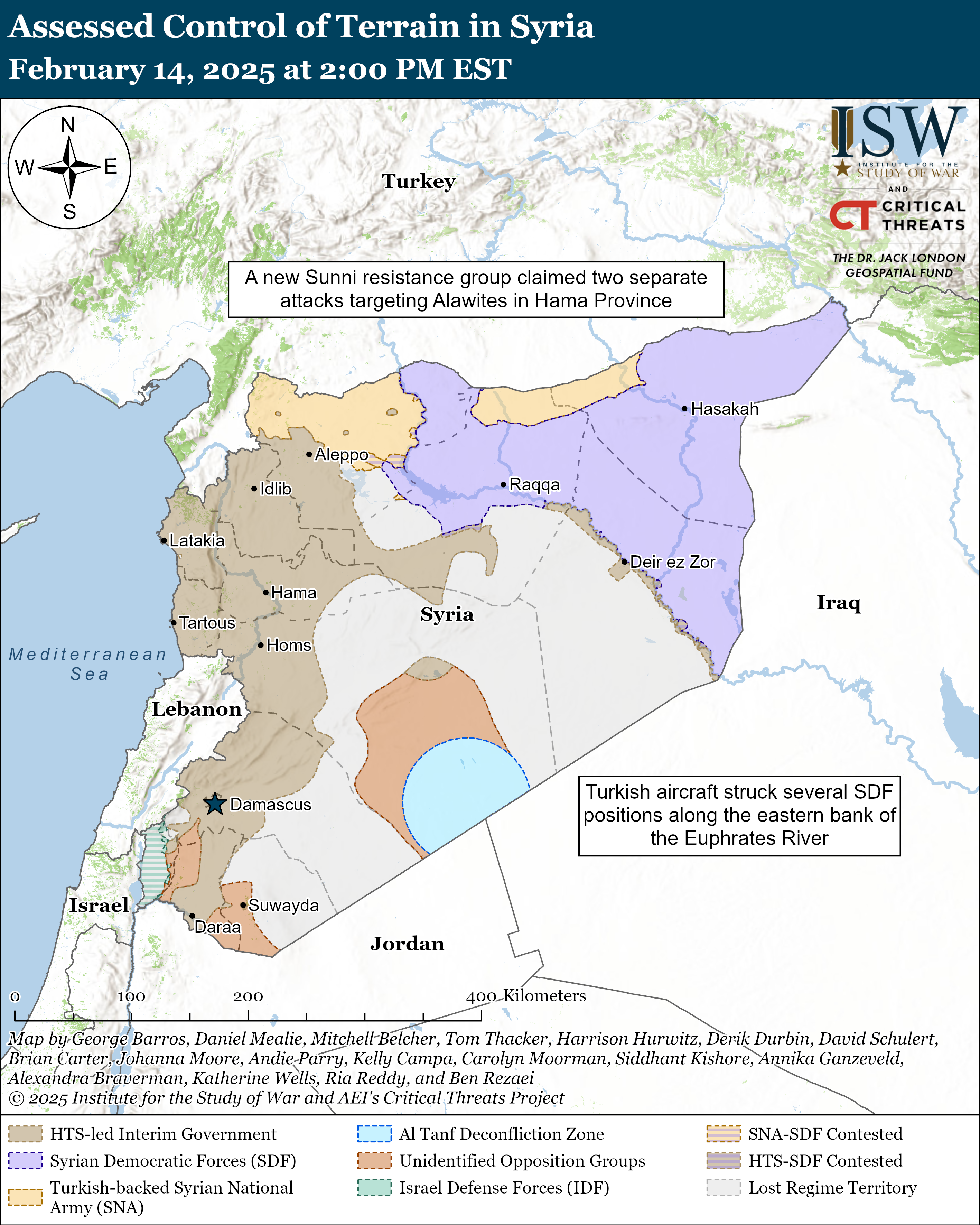 The Syrian interim government continued to take steps to consolidate and reform the state security sector on February 14. The Syrian Defense Ministry announced a ban on the transfer and sale of military assets, including weapons, ammunition, equipment, and technical equipment.[69] This ban would be consistent with the Defense Ministry’s efforts to dissolve all armed groups in Syria into the Syrian defense apparatus and keep weapons in state hands. The Syrian Interior Ministry announced the Public Security forces will be known as the “Internal Security Force.”[70] Public Security forces have deployed in Syrian interim government-controlled territory across Syria to maintain security and arrest suspected criminals or regime remnants since the fall of the regime.[71]