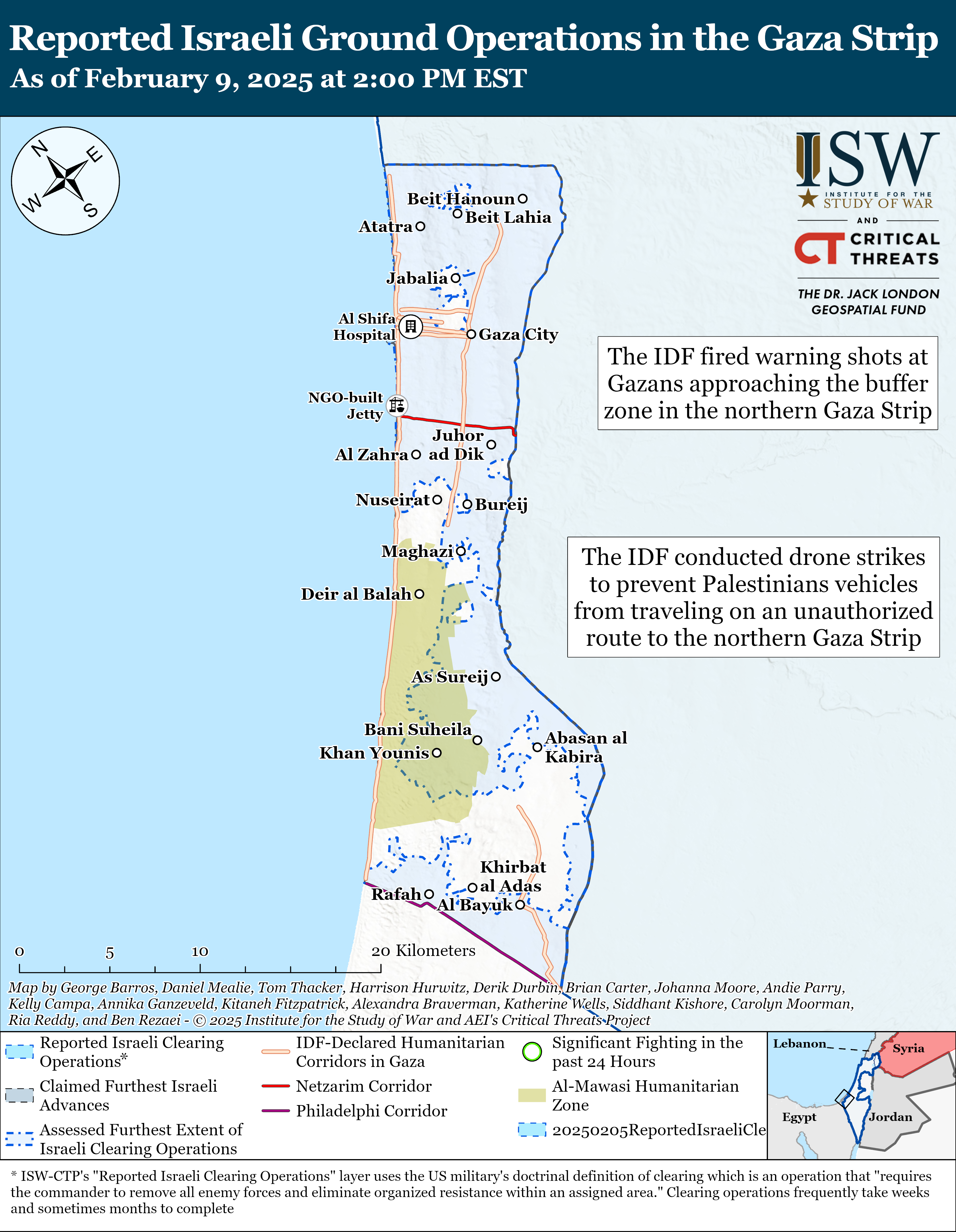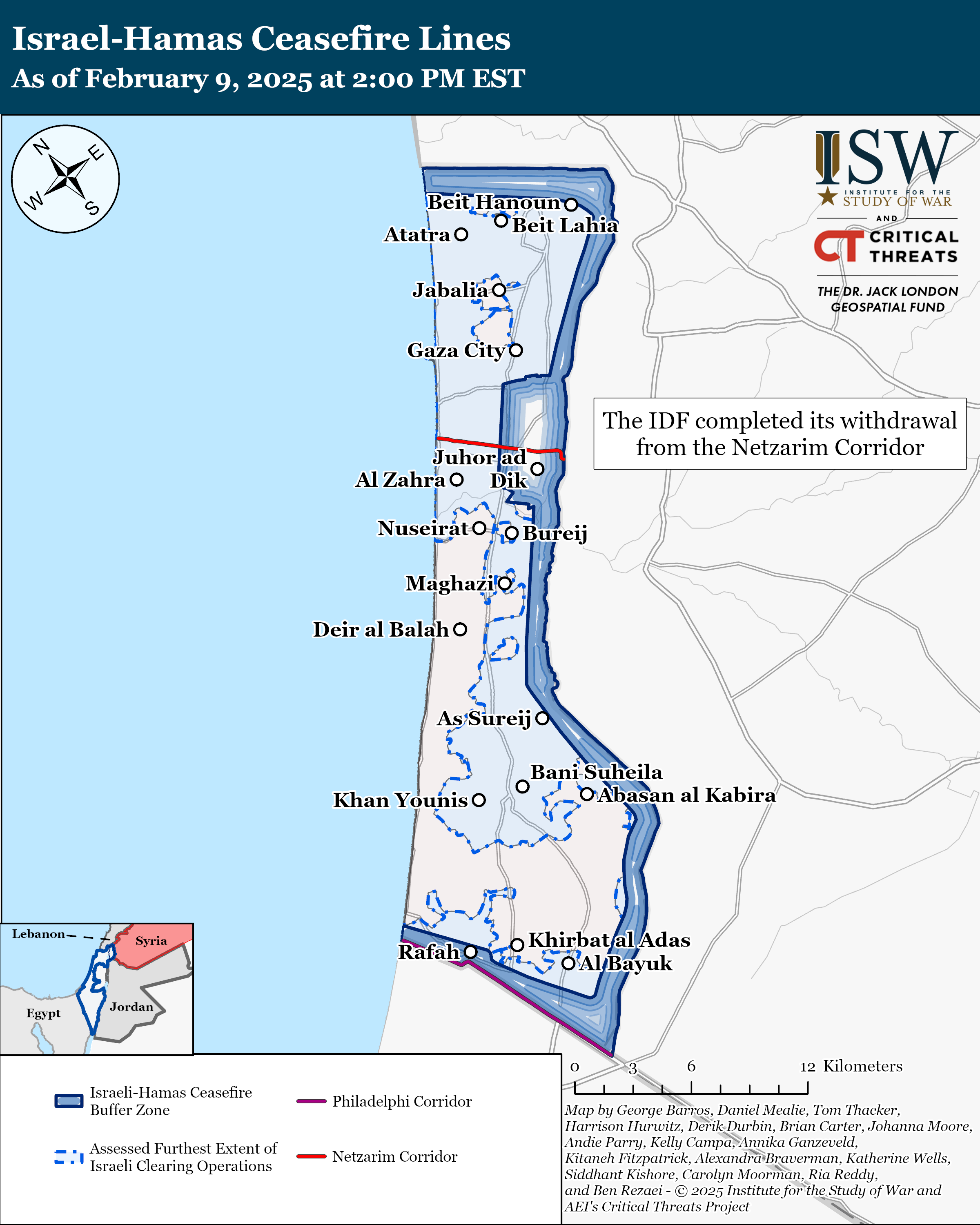 The Israel Defense Forces (IDF) completed its withdrawal from the Netzarim Corridor in the Gaza Strip on February 9 as part of its obligations under the ceasefire agreement with Hamas.[7] An Israeli military correspondent reported that the IDF withdrew from the eastern sector of the Netzarim Corridor to the buffer zone along the Israel-Gaza Strip border.[8] The IDF began withdrawing from the corridor on January 27 to allow Gazans to return via established routes to the northern Gaza Strip.[9] Hamas released three Israeli hostages on February 8 as part of its own ceasefire obligations.[10]