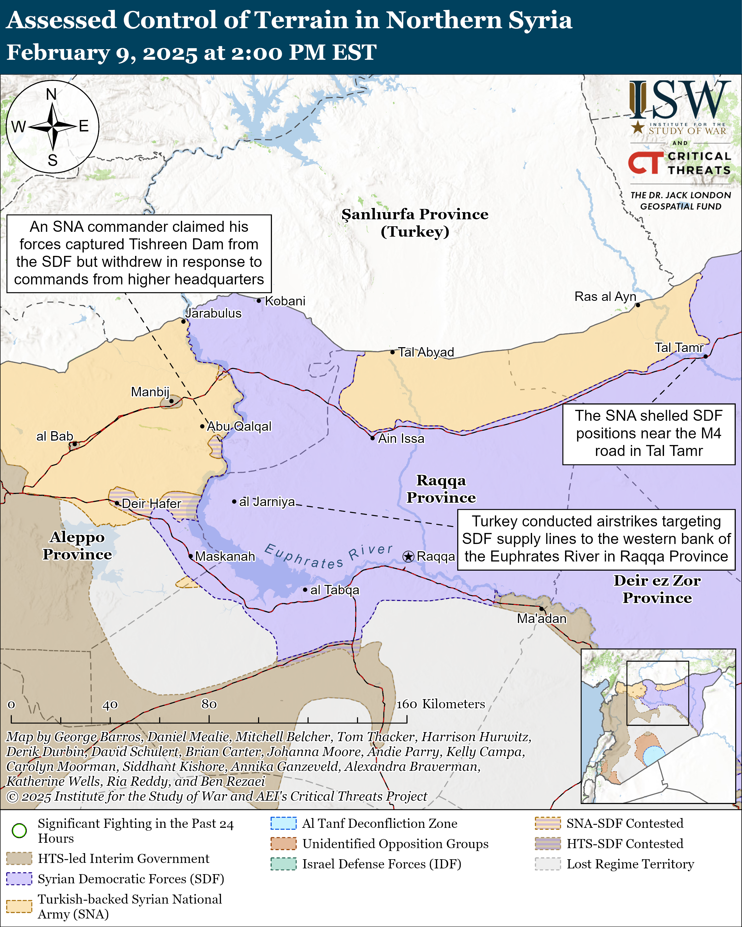 A Syrian National Army (SNA) commander claimed that his forces captured Tishreen Dam but withdrew after commands from higher headquarters.[11] The US-backed Syrian Democratic Forces (SDF) and SNA have fought at Tishreen Dam in eastern Aleppo Province since mid December 2024.[12] Suleiman Shah Brigades Commander “Abu Amsha” posted a video showing five of his fighters at the dam claiming that they captured it.[13] CTP-ISW cannot independently confirm the veracity of the video. Hamza Division Commander Saif Abu Bakr expressed congratulations on February 2 to Abu Amsha for his promotion to brigadier general and assuming command of the “25th Division” in the new Syrian army on February 2.[14] The SNA has begun to integrate its forces under the HTS-led interim government over the past several weeks and Syrian interim government forces have deployed to areas previously controlled by the SNA.[15] Abu Amsha said that his forces would resume their operations ”when the leadership issues a decision.”[16] The SNA continued to shell SDF positions near the dam on February 9.[17] Turkey separately conducted airstrikes targeting SDF supply lines to the western bank of the Euphrates River in Raqqa Province on February 8.[18]