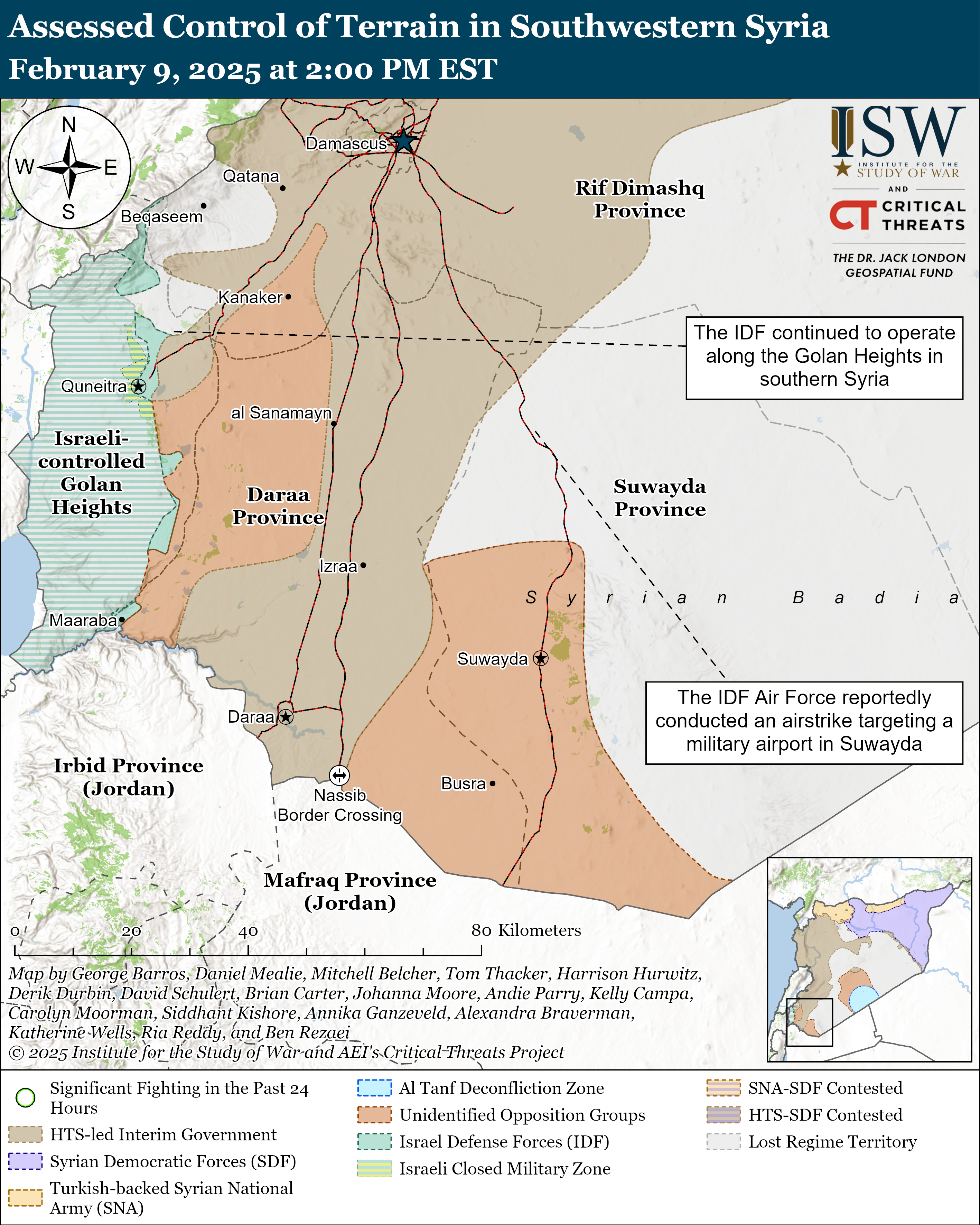 The IDF continued to operate along the Golan Heights in southern Syria. Local media reported that the IDF destroyed a former Assad military post in Ain al Nouriya, northeast of Khan Arnabeh in the Quneitra Province.[30] The IDF withdrew after destroying the site. The IDF also operated in Saysoun village around Yarmouk Basin, west of Daraa, on February 8.[31]