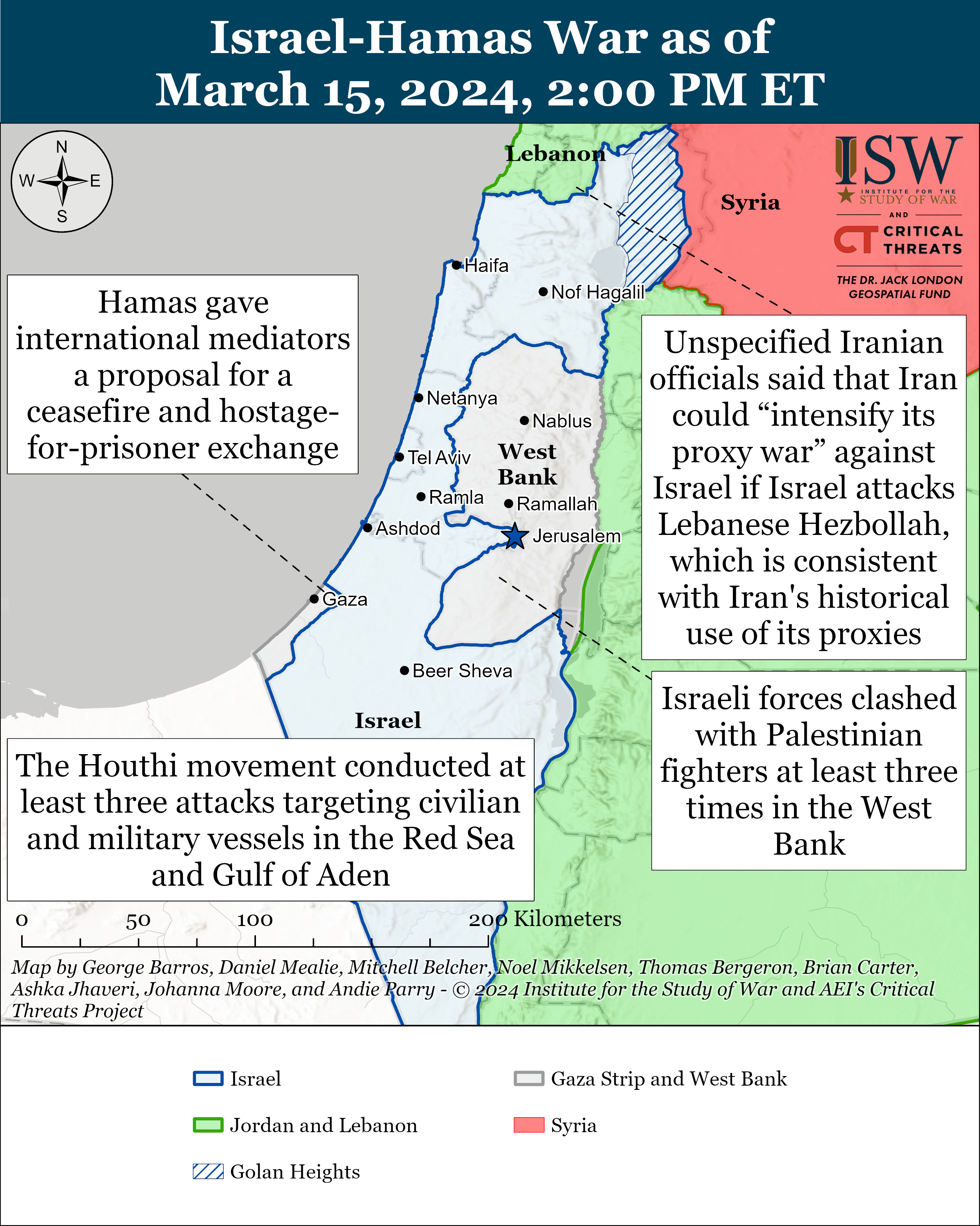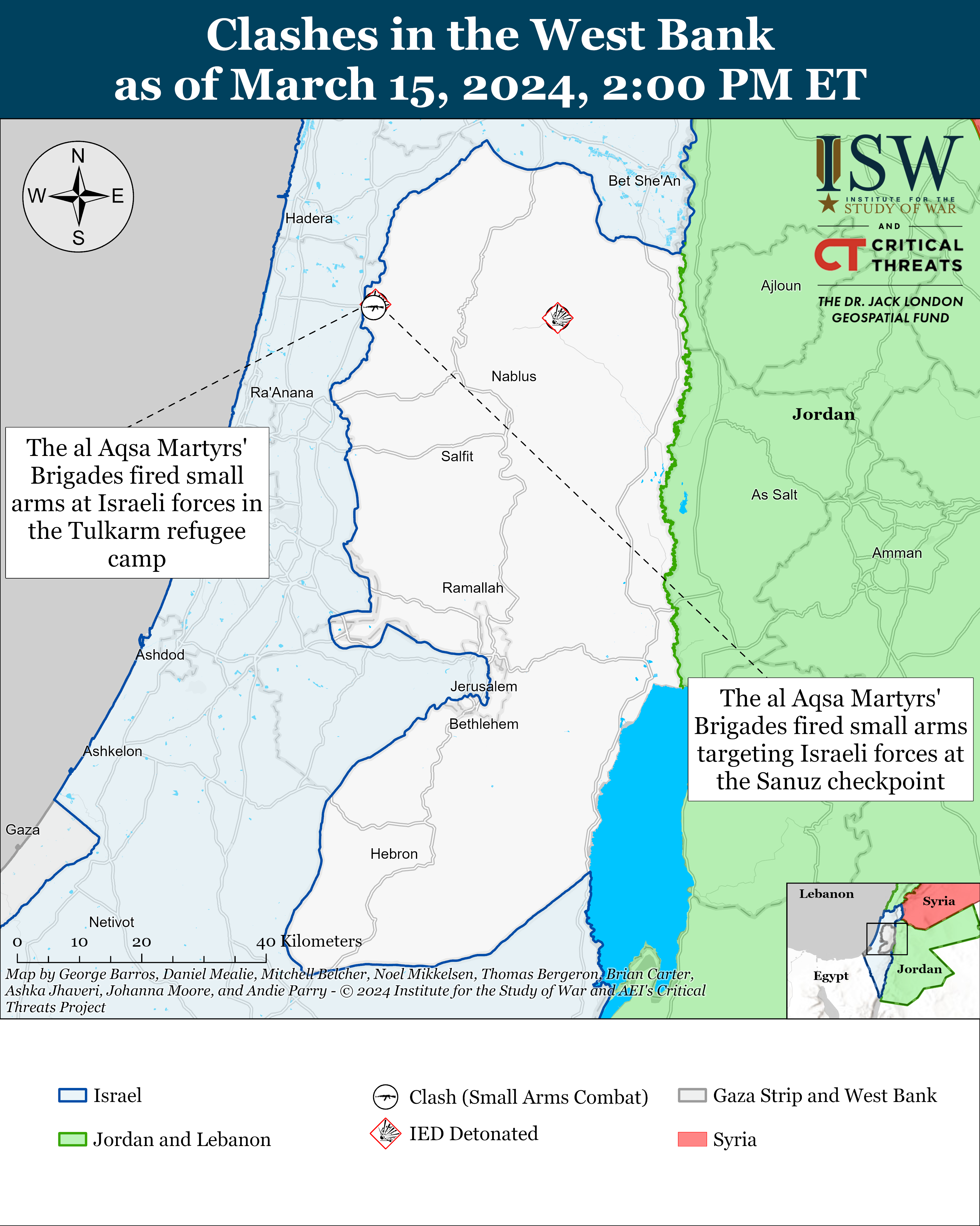 Israeli forces have clashed with Palestinian fighters at least three times in the West Bank since CTP-ISW’s last data cutoff on March 14.[36] The IDF said on March 15 that it has conducted over 60 ”brigade operations” in the West Bank since the Israel-Hamas war began.[37] The IDF also said that more than half of Palestinians that Israel has detained in the West Bank are associated with Hamas.[38]