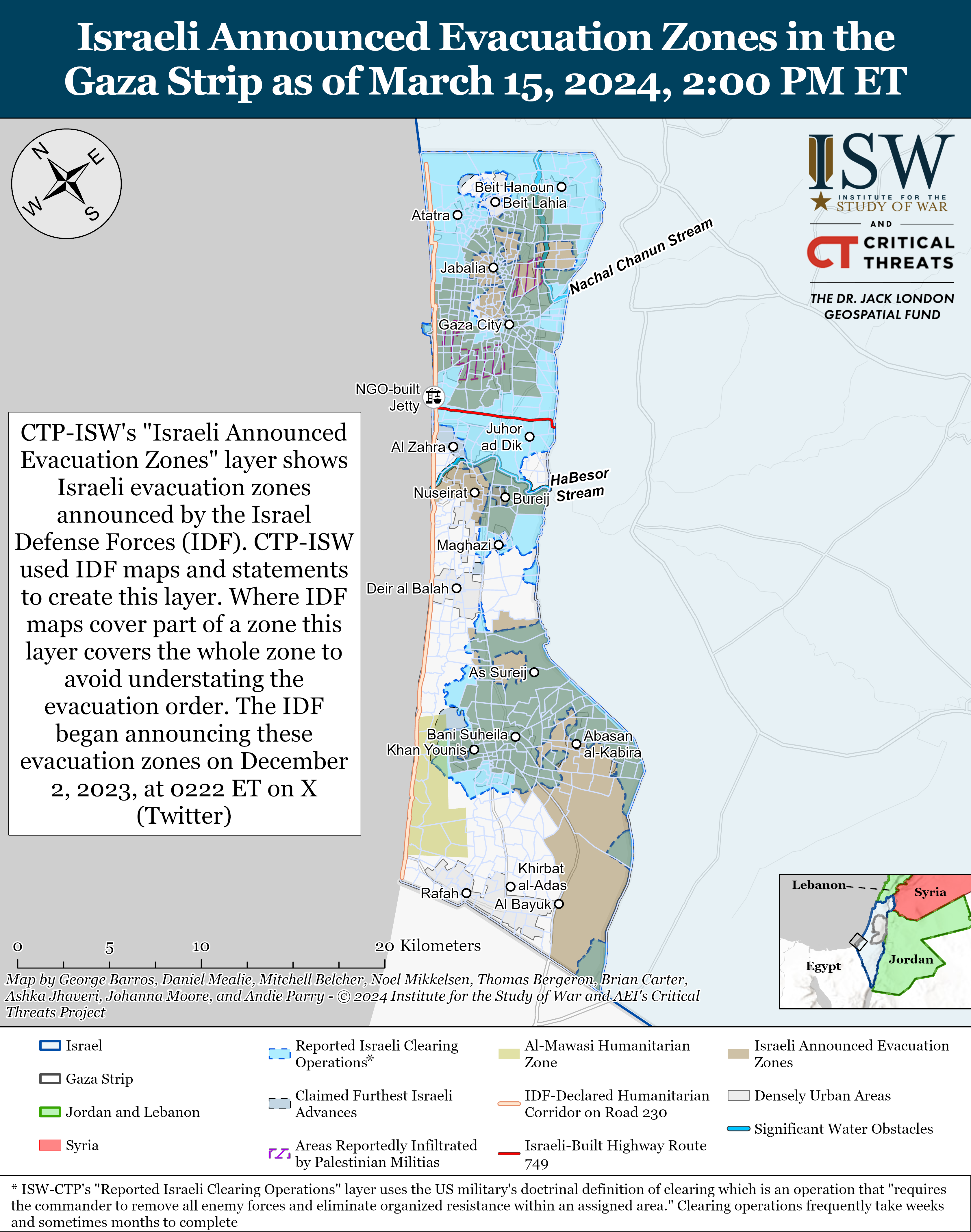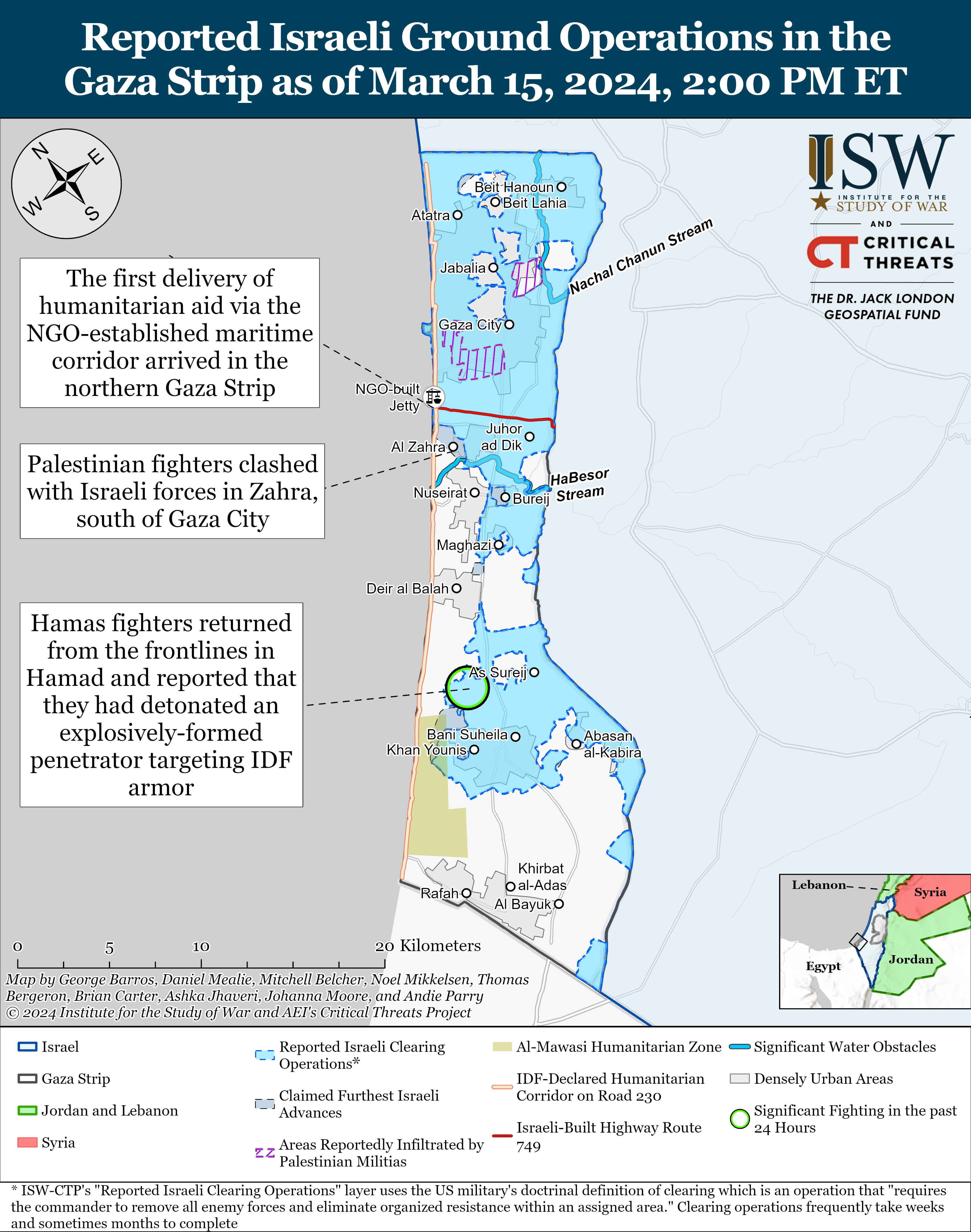 CORRECTION: The March 14, 2024, edition of the Gaza Strip maps described the jetty that is under construction along the Gazan coast to facilitate the delivery of aid as “Israeli-built.” NGO World Central Kitchen is building this jetty, not Israel.[1] We apologize for the error.