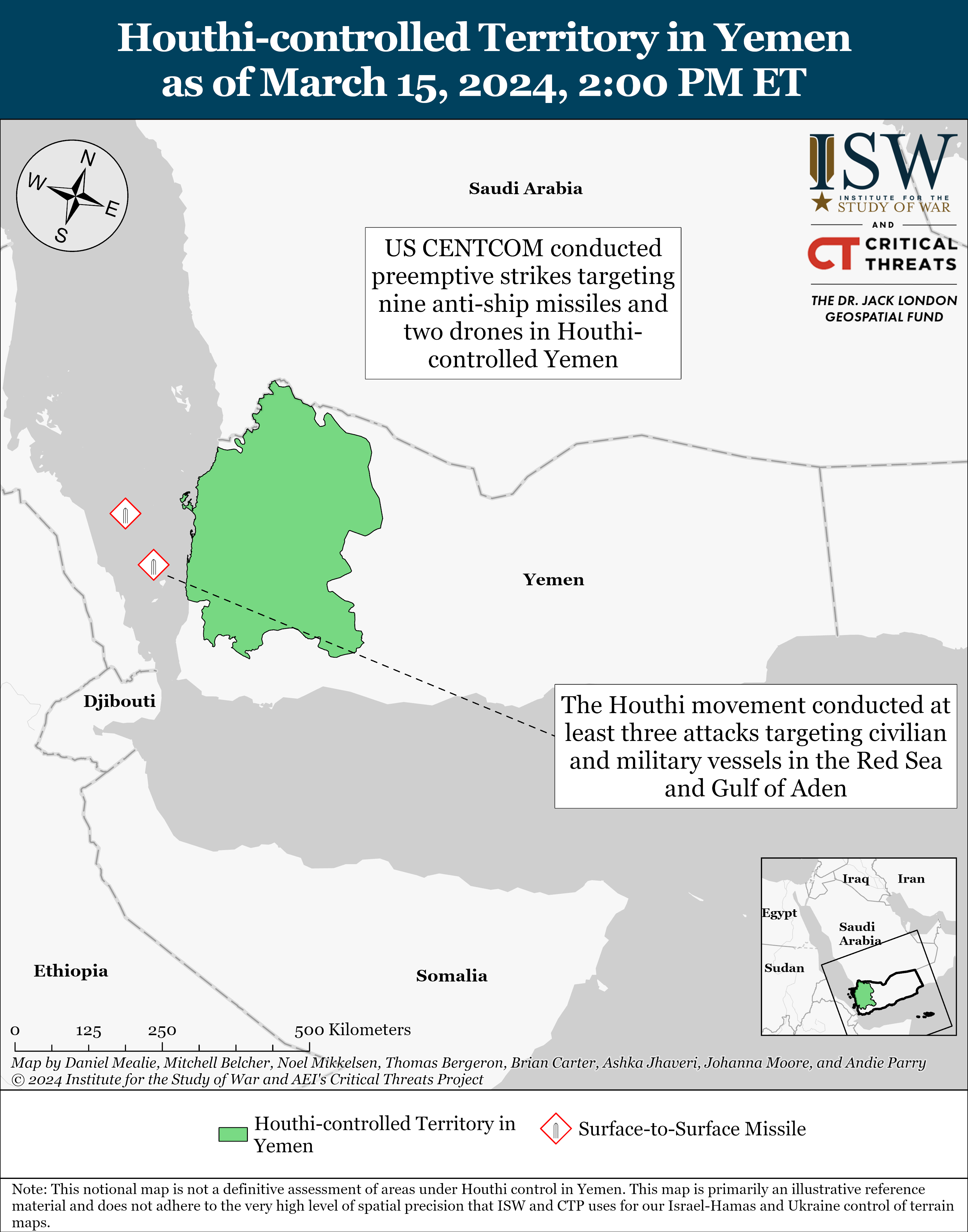 US CENTCOM reported on March 14 that it conducted preemptive strikes targeting nine anti-ship missiles and two drones in Houthi-controlled Yemen.[69] CENTCOM determined that the munitions presented an “imminent threat to merchant vessels and US Navy ships in the region.”