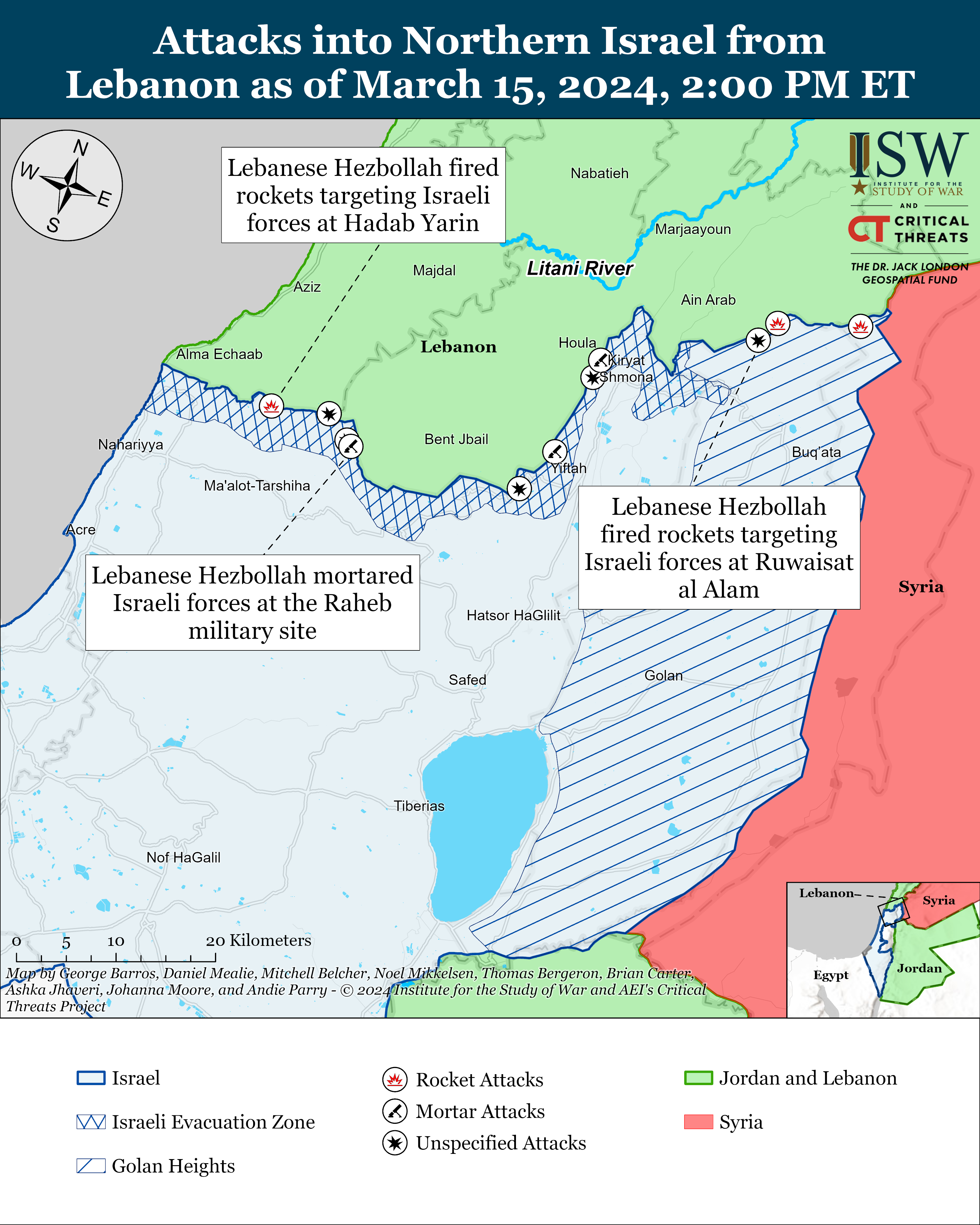 Iranian-backed militias, including Lebanese Hezbollah, have conducted at least 13 attacks from southern Lebanon into northern Israel since CTP-ISW’s last data cutoff on March 14.[43]