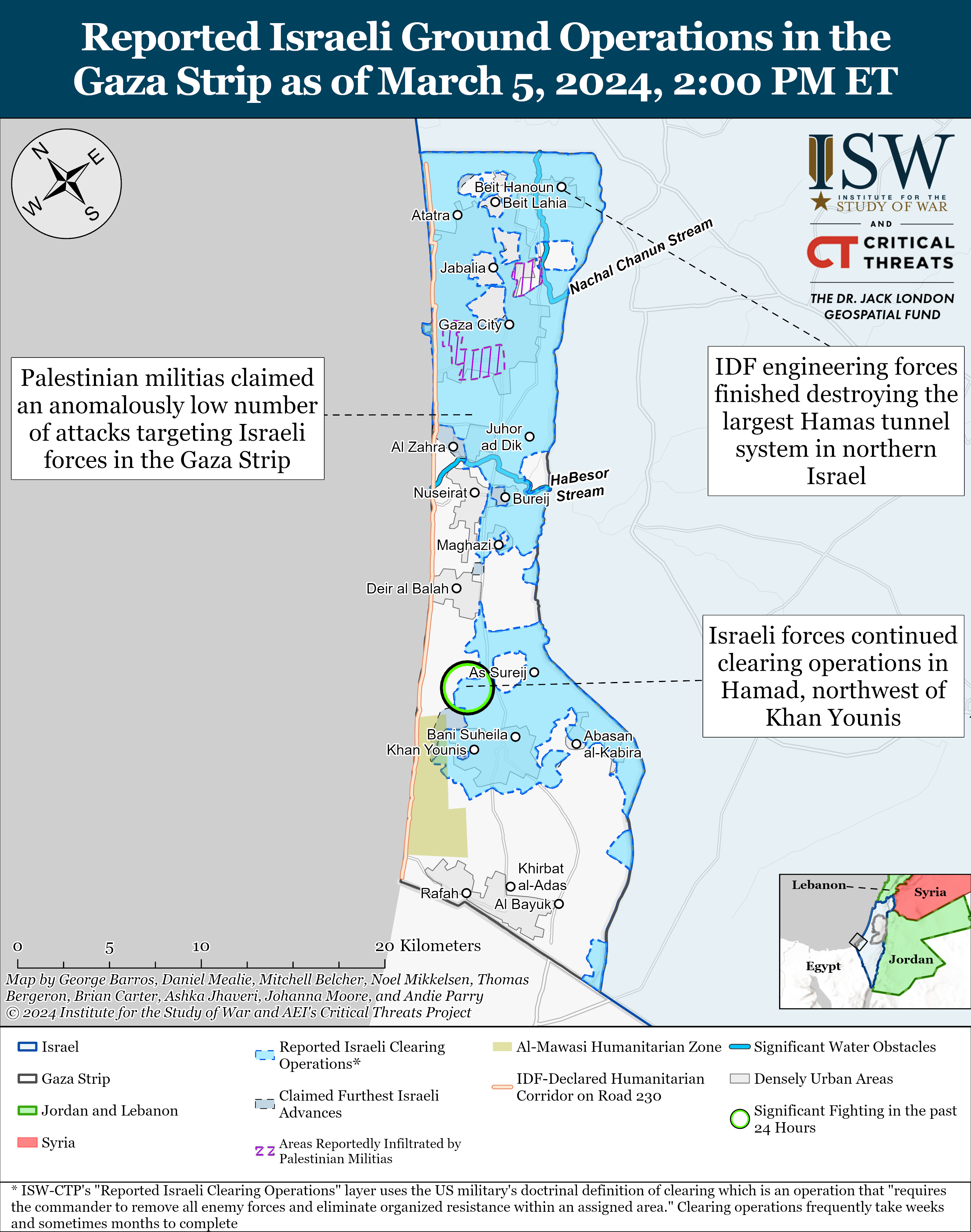 Israeli forces continued conducting clearing operations around northern Khan Younis on March 5. The IDF 89th Commando Brigade cleared militia infrastructure, including weapons caches, in Hamad neighborhood in northwestern Khan Younis.[31] The IDF 7th Brigade evacuated civilians from Hamad and detained dozens of Hamas and PIJ fighters who tried to hide among evacuating civilians to escape the area.[32] The IDF began operating in Hamad on March 3.[33] The IDF LOTAR counterterrorism unit (attached to the 7th Brigade) cleared two weapons storage sites in civilian areas of Khan Younis.[34] The IDF said that one of the sites was adjacent to a school in Khan Younis formerly used as a shelter for displaced Gazans.[35]