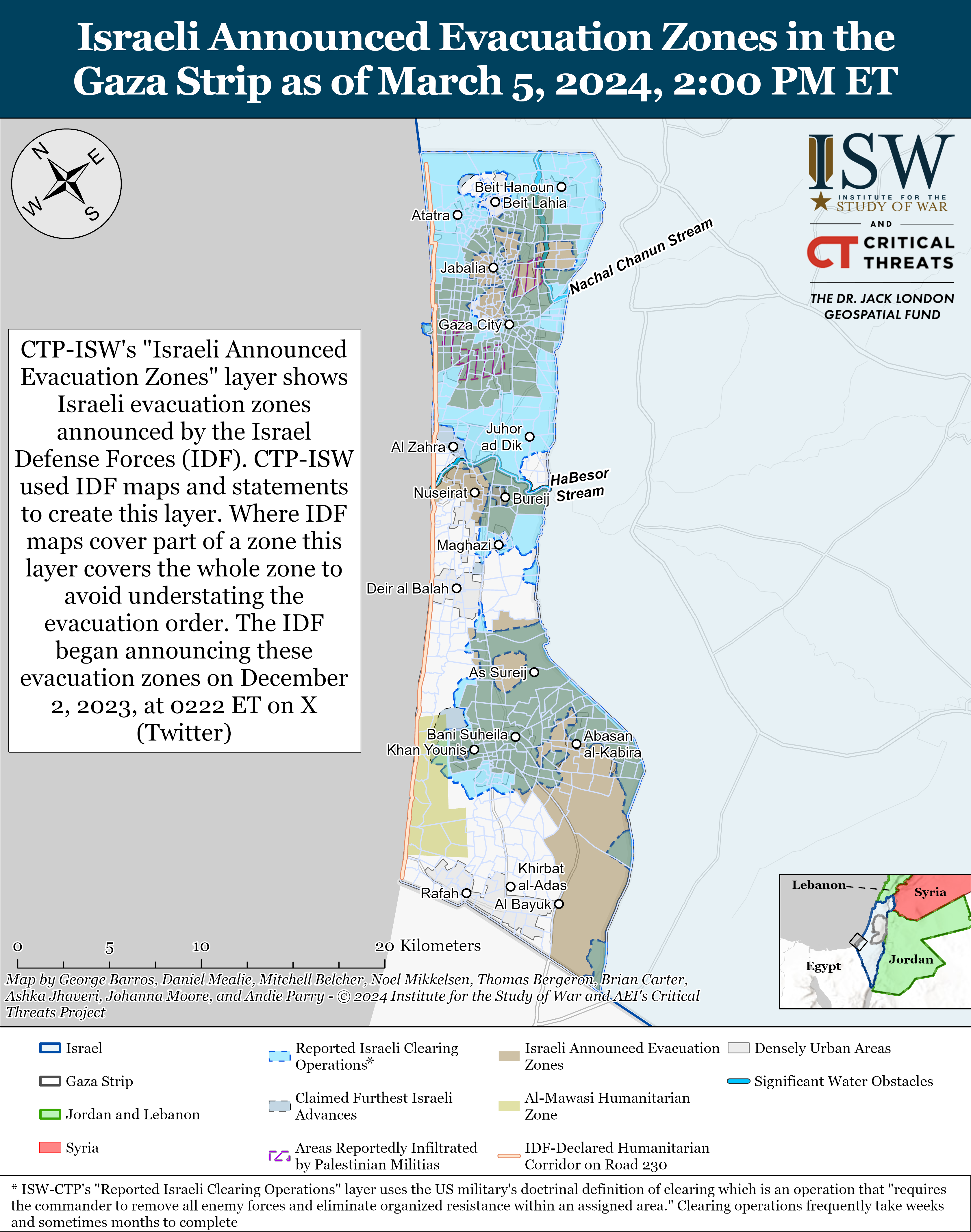 - Gaza Strip: Palestinian militias claimed an anomalously low number of attacks targeting Israeli forces in the Gaza Strip on March 5. CTP-ISW is considering two factors to explain the sharp decrease in attack claims.