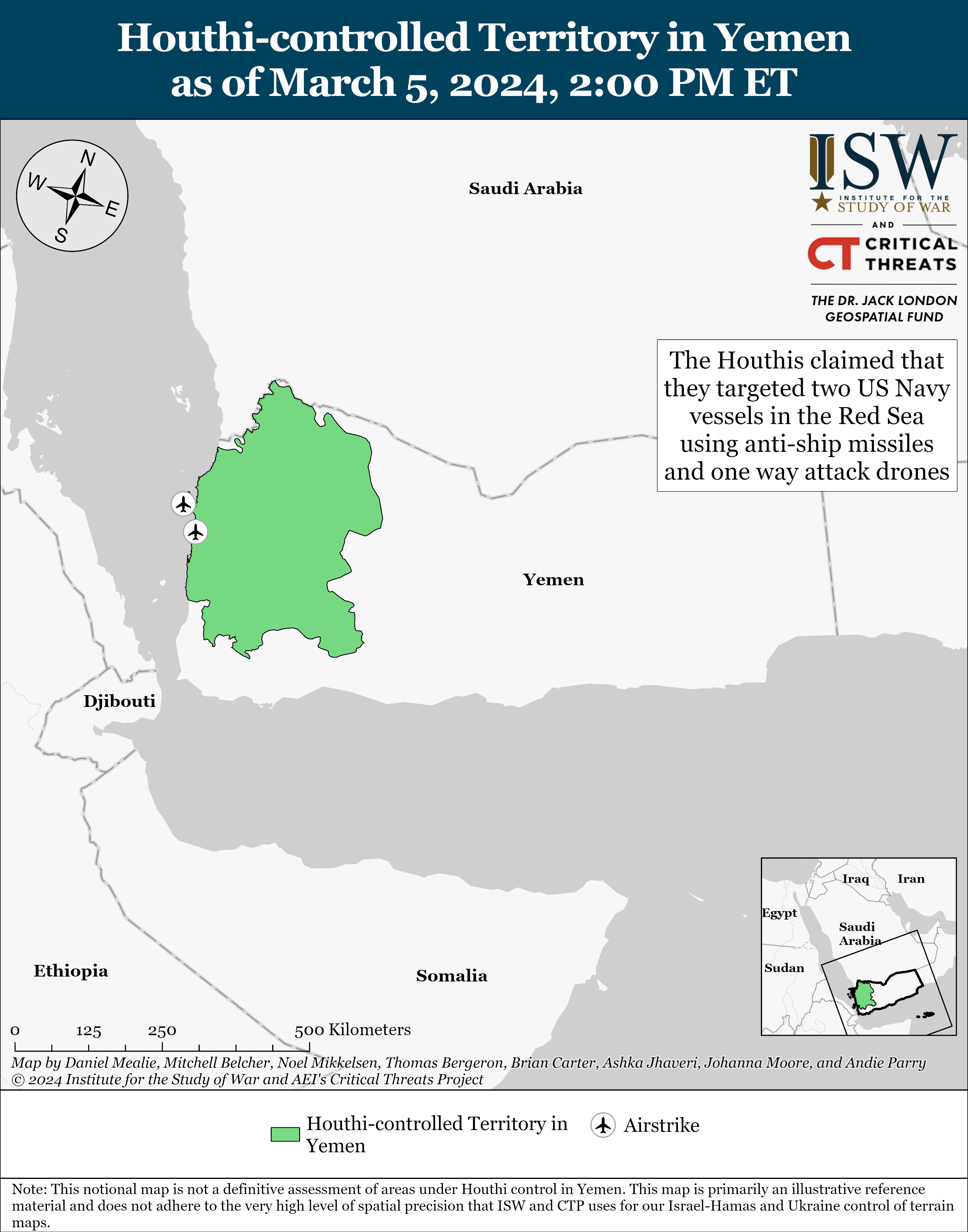 The Houthis claimed that they targeted two US Navy vessels in the Red Sea using anti-ship missiles and one way attack drones on March 5.[46] Houthi military spokesperson Brig. Gen. Yahya Sarea said that the Houthis ”will not hesitate to expand their operations against all hostile targets” in support of Palestinians in Gaza.[47]