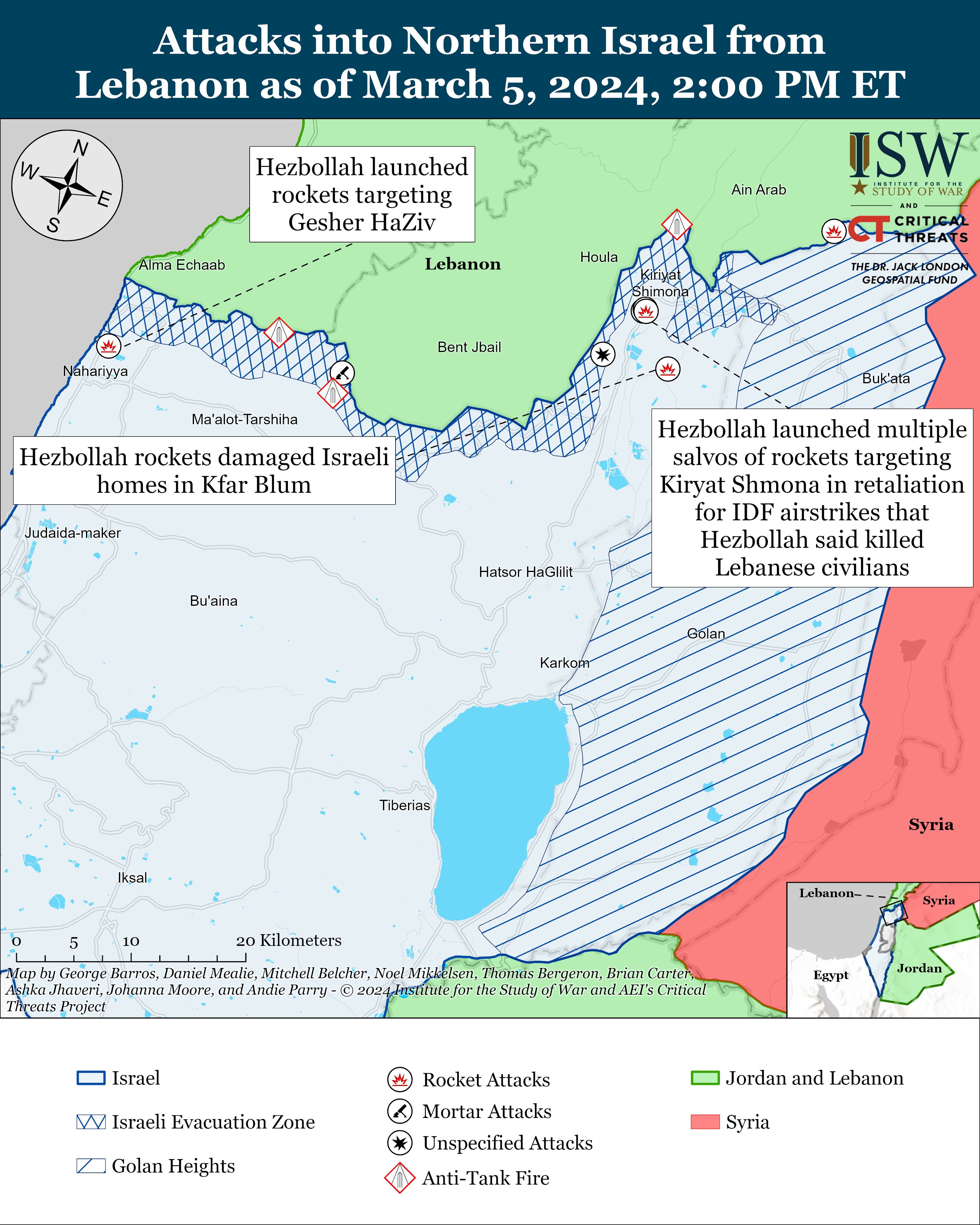 Lebanese Hezbollah has conducted at least 13 attacks from southern Lebanon into northern Israel since CTP-ISW’s last data cutoff on March 4.[39] Hezbollah launched at least three salvoes of “dozens of rockets” targeting Gesher HaZiv, Kiryat Shmona, and Kfar Blum, in northern Israel.[40] Israeli media reported that multiple civilians’ homes were damaged in the rocket attacks targeting Israel.[41] Hezbollah claimed that the attacks were in response to IDF airstrikes that killed Hezbollah-affiliated paramedics in Adissa on March 4 and Lebanese civilians in Hula, southern Lebanon, on March 5.[42]