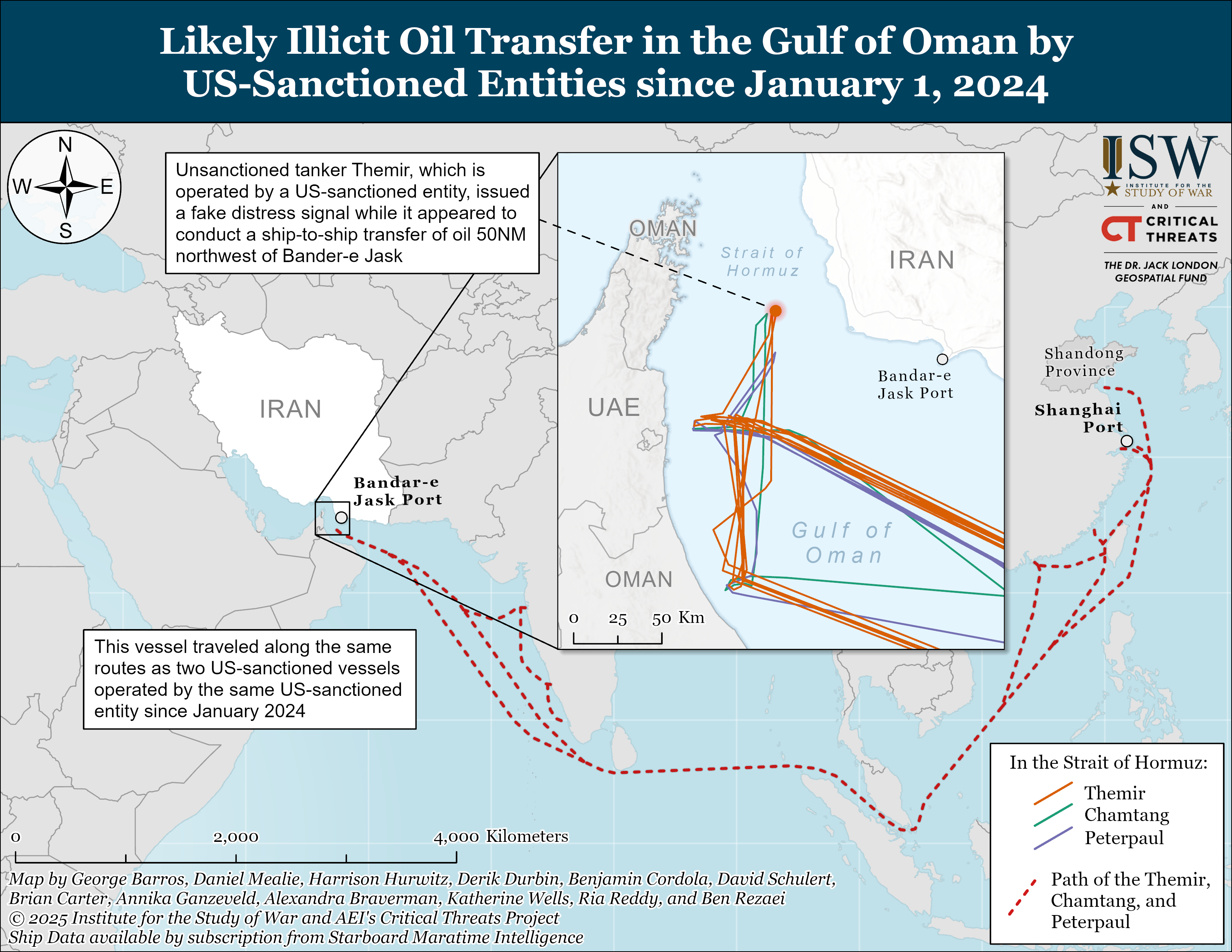The Themir’s pattern of behavior suggests it may have conducted a ship-to-ship transfer at some time while off the coast of Iran.[6] Iran and the PRC use ship-to-ship transfers to obfuscate the transportation of PRC purchases of Iranian oil, and ships travel in circular holding patterns when conducting ship-to-ship transfers.[7] The Themir was in a circular holding pattern 51 nautical miles northwest of Bandar-e Jask Port on the southern coast of Iran at the time of the distress call, according to maritime data.[8] The ship and its two sister ships—the Peterpaul and the Chamtang—have regularly sailed between the Gulf of Oman and the PRC.[9] Both the Peterpaul and the Chamtang are sanctioned for illicit transfers of Iranian oil to the PRC.[10] The ships usually enter circular holding patterns in the Gulf of Oman before sailing eastwards to PRC ports. Circular holding patterns can indicate that the ships are executing ship-to-ship transfers.[11] The Themir also previously travelled from the Gulf of Oman to the PRC’s biggest oil offloading port, Shandong Port, in September 2024.[12] The US Treasury Department recently sanctioned refineries in Shandong for importing billions of dollars in Iranian oil.[13] The Themir has also travelled along similar routes as its two sanctioned sister ships from near Bandar-e-Jask Port to eastern PRC through the Gulf of Oman and Malacca Strait five times since January 2024, suggesting that the Themir has previously illicitly transported Iranian oil to the PRC.[14]