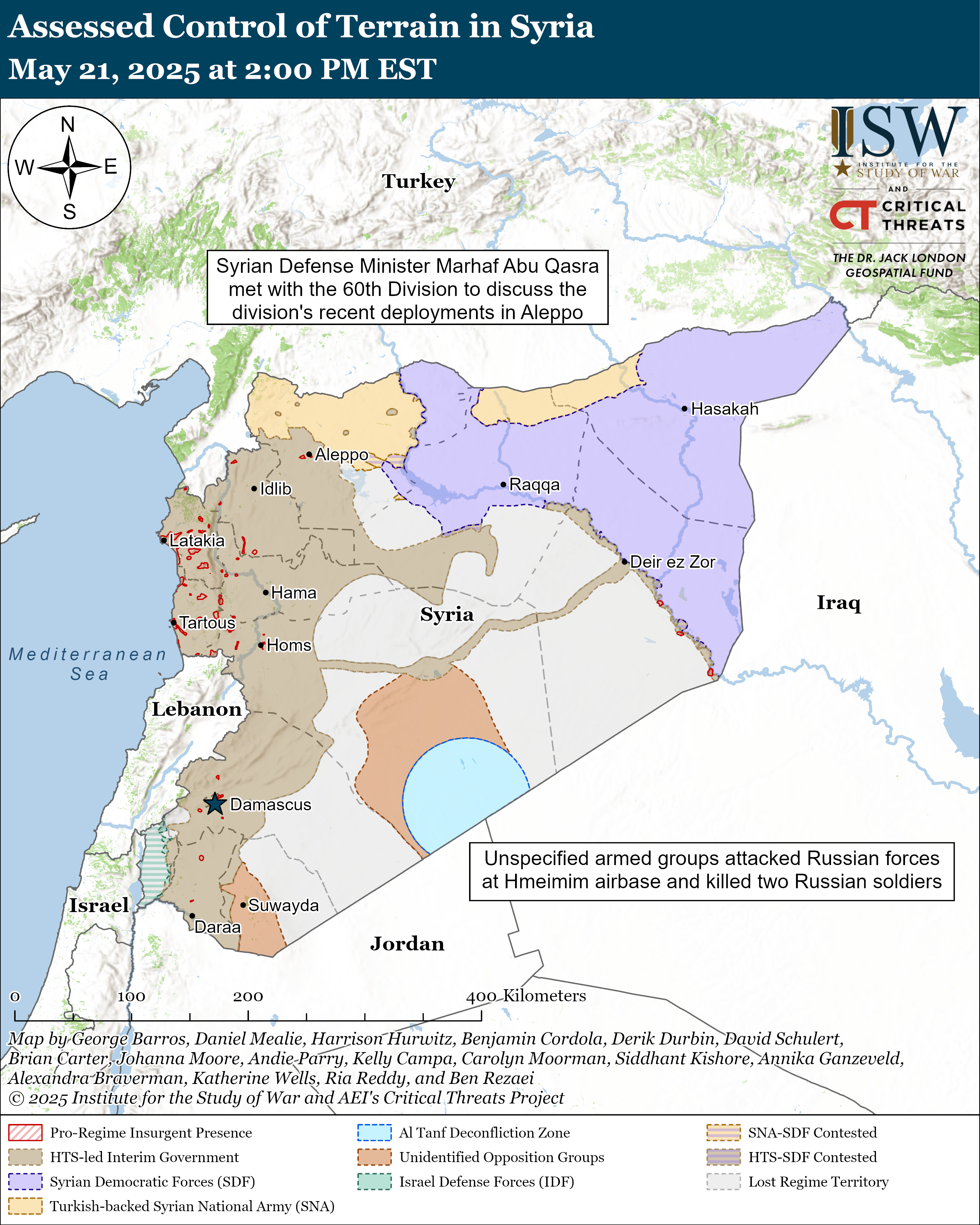 - Russians in Syria: A group of unspecified fighters attacked Russian forces stationed at Hmeimim air base, Latakia Province, on May 20. Syrian sources claimed that the attackers were foreign military trainers for HTS who attacked the Russians without approval from HTS.