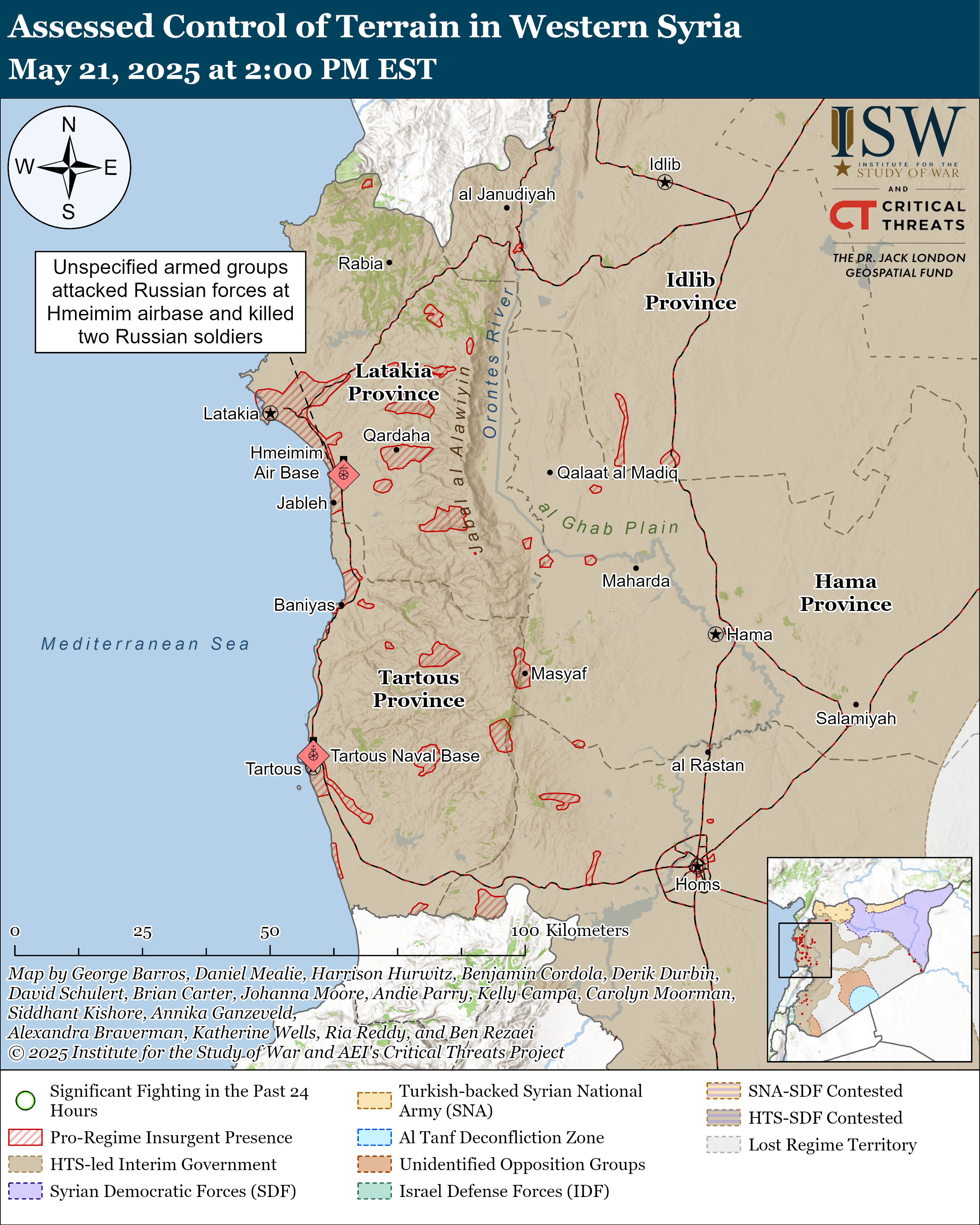 A group of unspecified fighters attacked Russian forces stationed at Hmeimim air base, Latakia Province, on May 20.[28] The Syrian transitional government is extremely unlikely to have sanctioned any attack on Russian forces at Hmeimim, given Syria and Russia’s active negotiations over the two countries’ economic and military cooperation. The militants attacked the southwest perimeter of the airfield but retreated after Russian forces killed at least three fighters.[29] The fighters killed two Russian soldiers at the base.[30] Russian sources at the time of the attack claimed that the attackers were Uzbek foreign fighters who were unaffiliated with Syrian security forces.[31] Syrian sources later claimed that the attackers were foreign military trainers for HTS who attacked the Russians without orders, however.[32] Uzbek nationals and Central Asians have historically made up an important portion of HTS’s military structure, including training HTS special forces.[33] HTS-allied Central Asian and Caucasian armed groups such as Katibat al Tawhid wa Jihad (KTJ), the Turkistan Islamic Party (TIP), and Ajnad al Kavkaz (Soldiers of the Caucasus) are known for their extreme loyalty to HTS.[34] It is unlikely that these factions and their associated private military companies would act independently of HTS’s chain of command, given that HTS has integrated foreign fighters into the transitional government’s military.[35] Foreign fighters in HTS are particularly unlikely to disobey HTS leaders because they have few options if they disobey orders and are deported or imprisoned. A return to their home countries would result in jail time at a minimum.