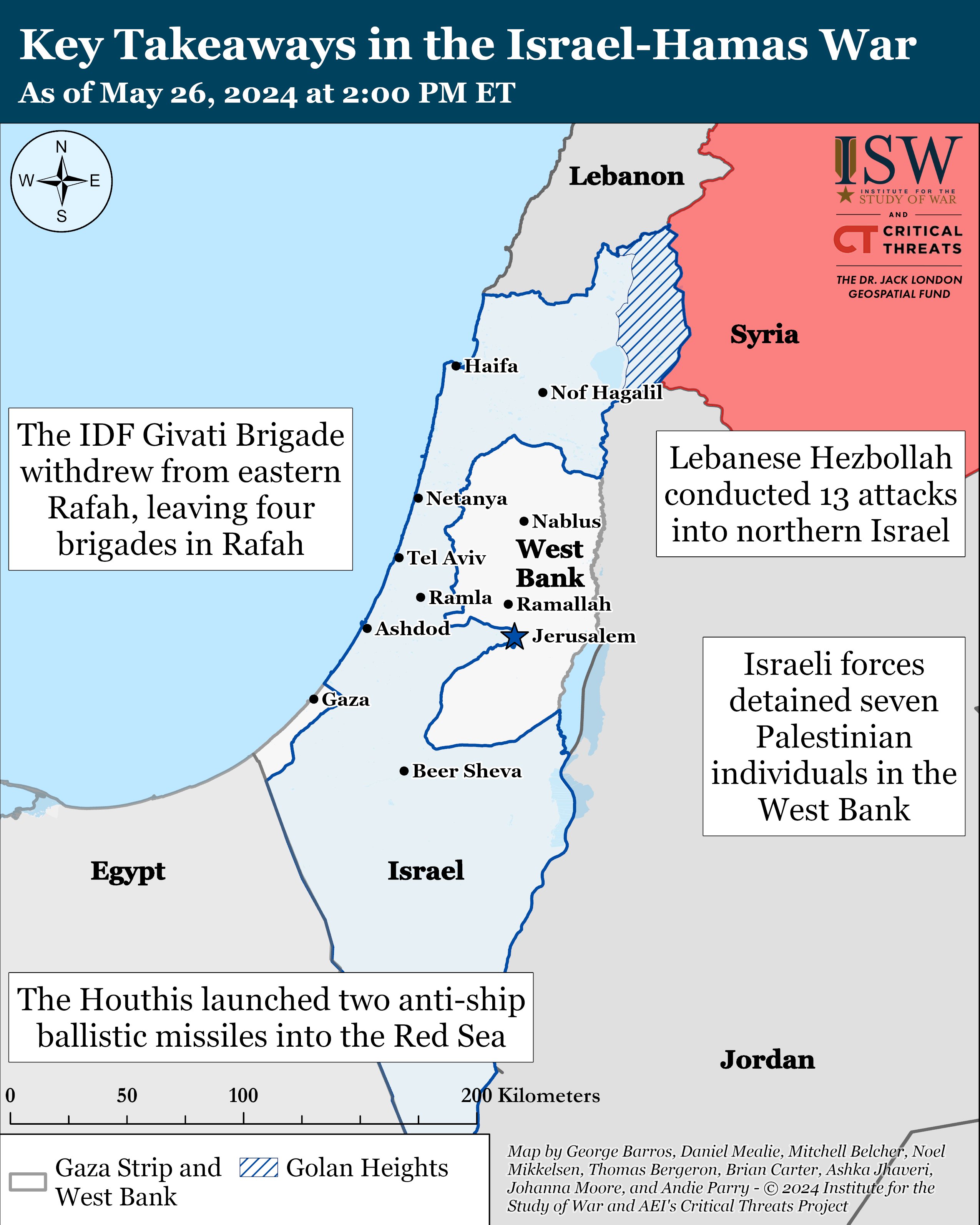 Ceasefire negotiations between Israel and Hamas are scheduled to resume on May 28 in Cairo, according to an Egyptian official speaking to CNN.[23] An Israeli official similarly confirmed talks are set to resume next week but did not specify the location.[24] Israeli Mossad Chief David Barnea reportedly presented Israel’s latest ceasefire and hostage release proposal to US and Qatari mediators in Paris on May 25.[25] Hamas officials denied receiving Israel’s new proposal.[26] The Israeli War Cabinet is expected to convene to discuss the negotiations and clearing operations in Rafah on May 26.[27]