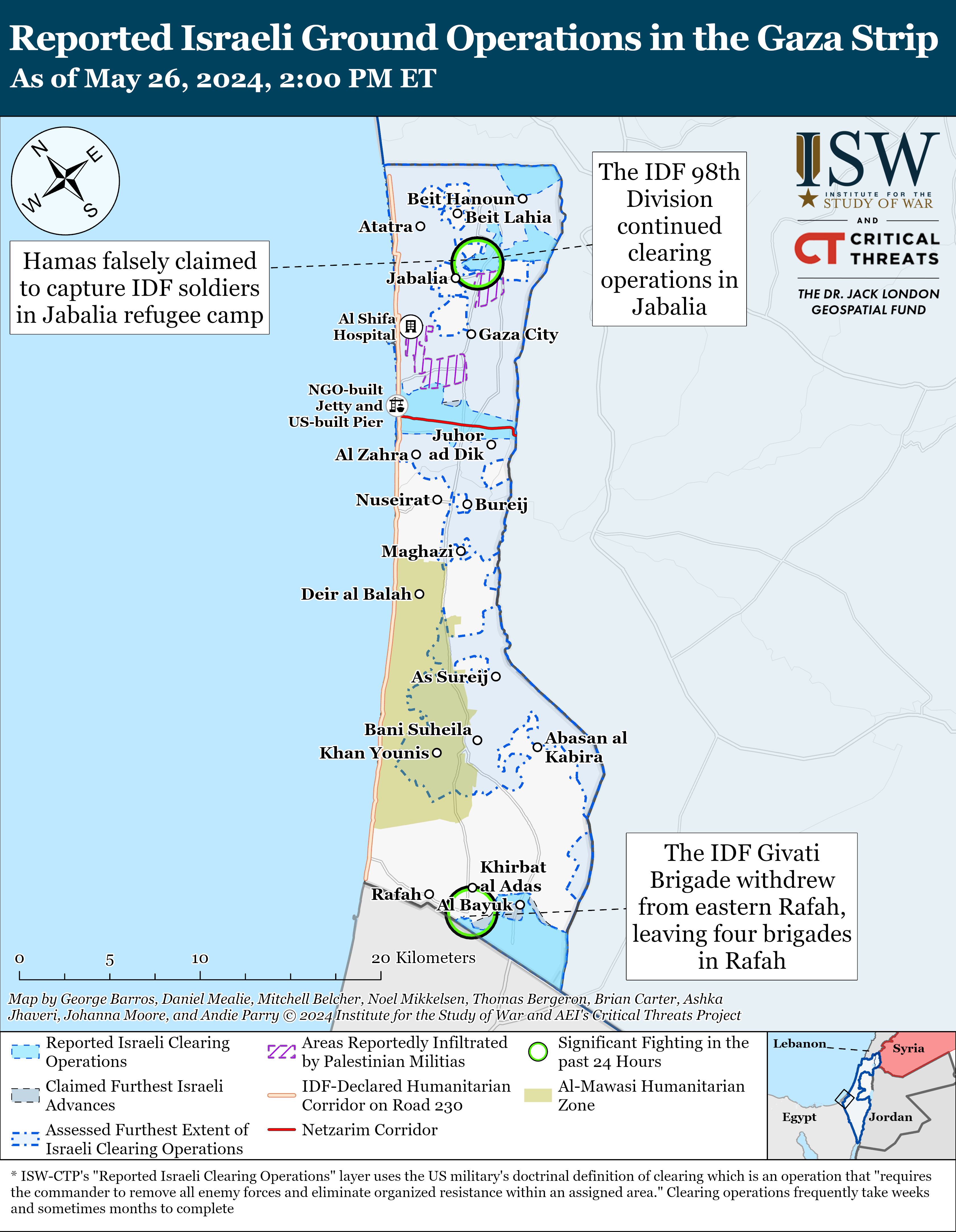 The IDF Givati Brigade withdrew from eastern Rafah on May 26, according to Israeli media.[12] The IDF now has four brigades in Rafah. The Givati Brigade operated in Rafah for three weeks after several deployments to Khan Younis and Gaza City throughout the war.[13] Israeli media reported that Israeli forces had “thinned out” east of Rafah.[14] Israeli sources linked the IDF’s changing disposition in Rafah to the imminent ceasefire negotiations and the International Court of Justice (ICJ) order to halt clearing operations into Rafah.[15] The IDF will reportedly continue to operate in Rafah in a “restrained fashion.”[16] The IDF is moving “more deliberately” in Rafah, according to Israeli officers who recently left Rafah and spoke to the New York Times on May 25.[17]