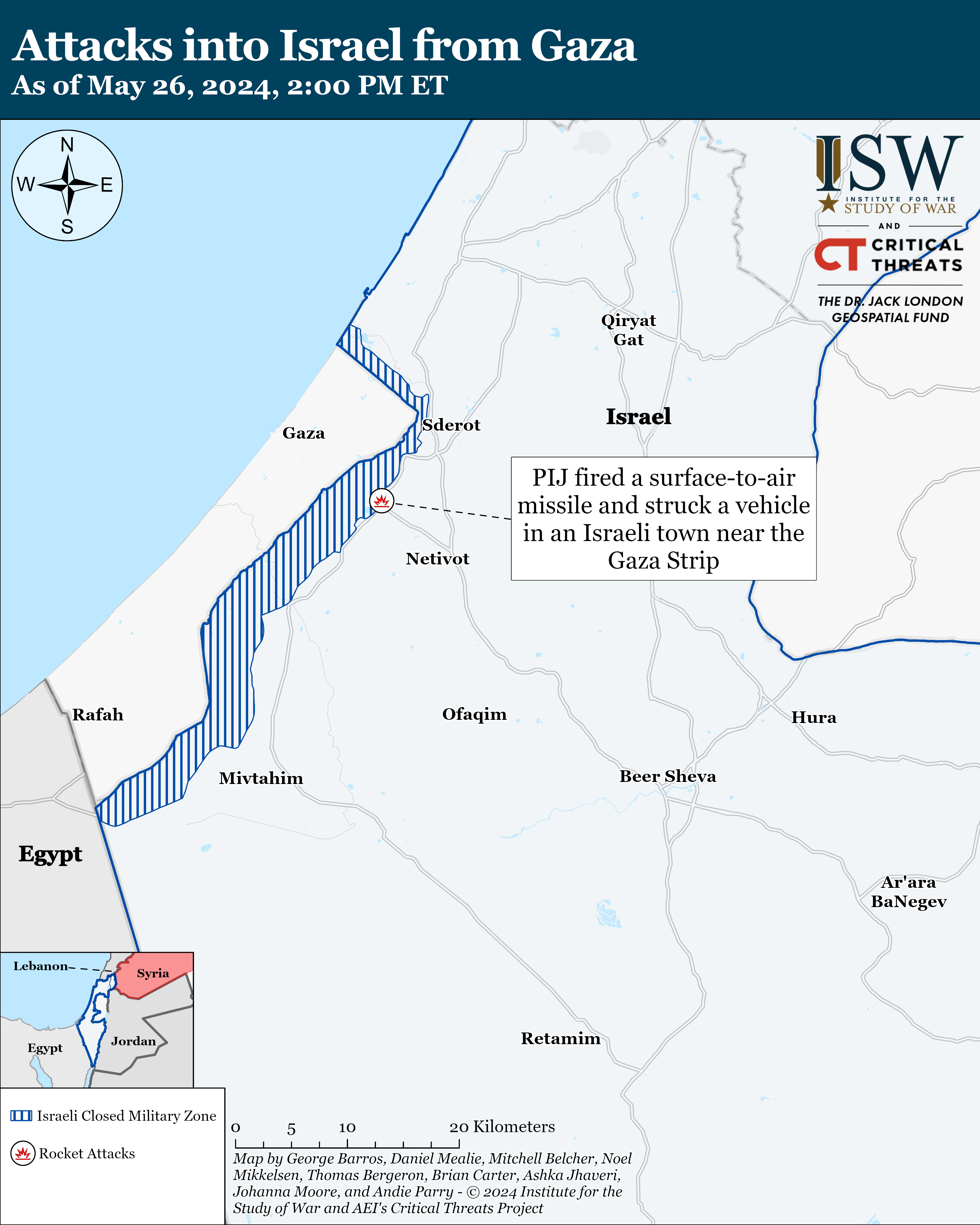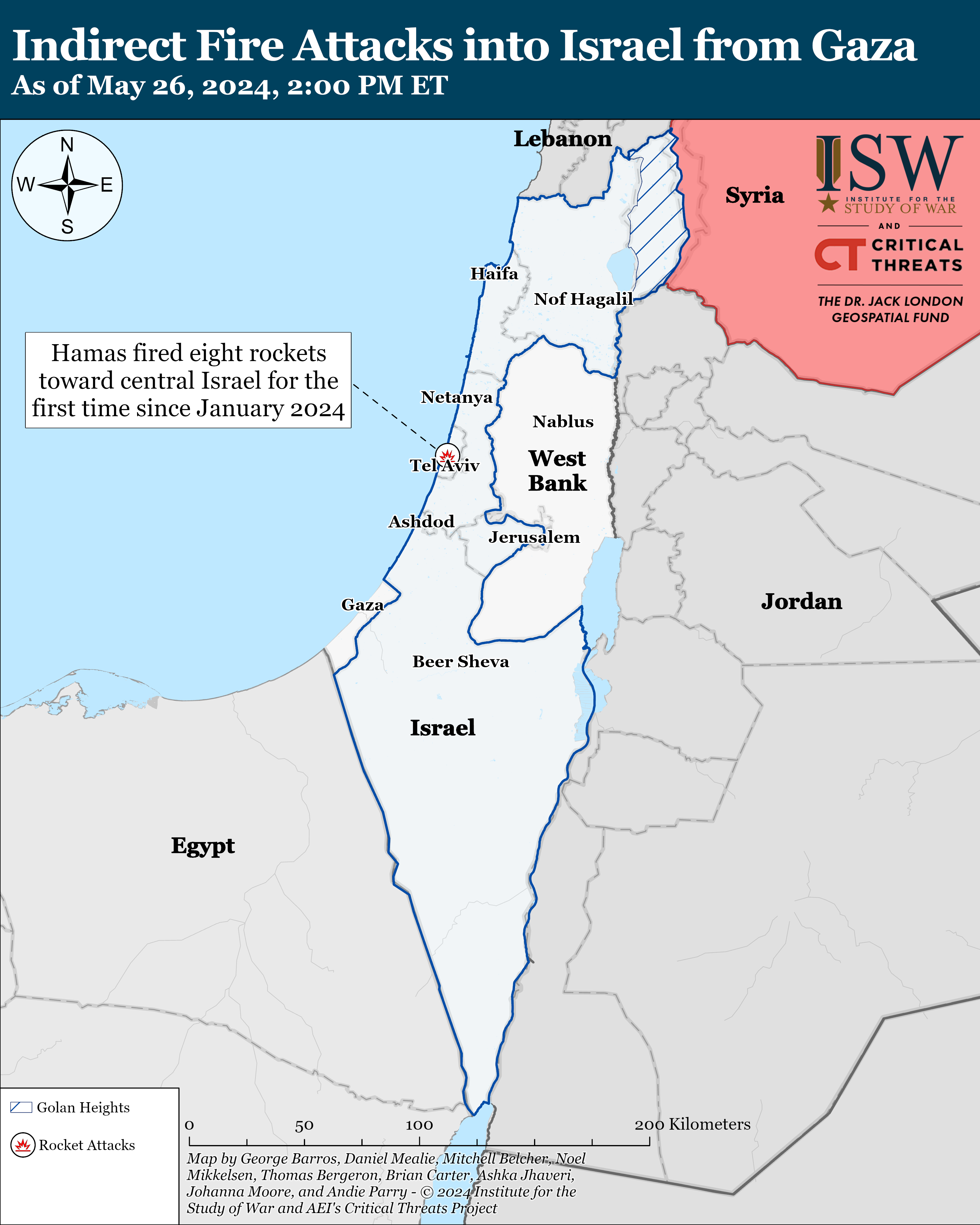 Hamas fired a rocket barrage at central Israel from Rafah on May 26.[30] The IDF said that Hamas fired eight rockets from Rafah.[31] Hamas last targeted central Israel in late January 2024.[32] Israeli air defenses intercepted several on the rockets.[33] Several rockets struck uninhabited areas in central Israel, north of Tel Aviv.[34] Israeli War Cabinet member Benny Gantz said that the Hamas rocket barrage on central Israel fired from Rafah demonstrates why Israel needs to continue its clearing operation there.[35] The IDF Air Force struck two rocket launchers in Rafah aimed at Kerem Shalom prior to the Hamas rocket attack.[36] PIJ also fired a ”surface-to-air missile” at an Israeli town near the Gaza Strip on May 26.[37] The attack damaged a vehicle.[38]
