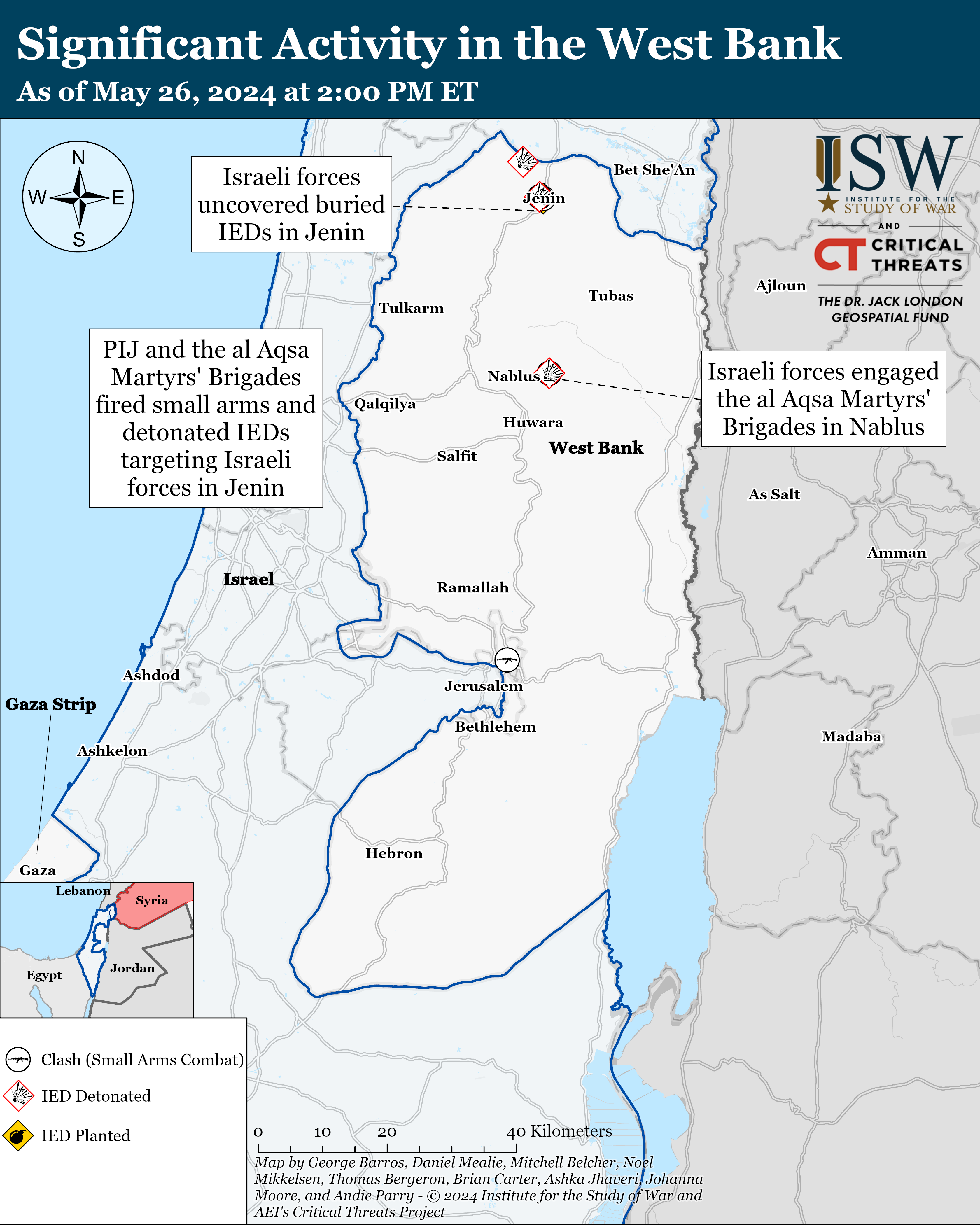 Israeli forces engaged Palestinian fighters in at least three locations in the West Bank on May 26.[39] A Palestinian journalist reported that over 30 IDF vehicles entered Jenin and isolated Jenin refugee camp from Jenin City.[40] Al Aqsa Martyrs’ Brigades and PIJ fighters clashed with Israeli forces using small arms and detonated IEDs in Jenin.[41] The IDF uncovered IEDs buried near Jenin.[42]