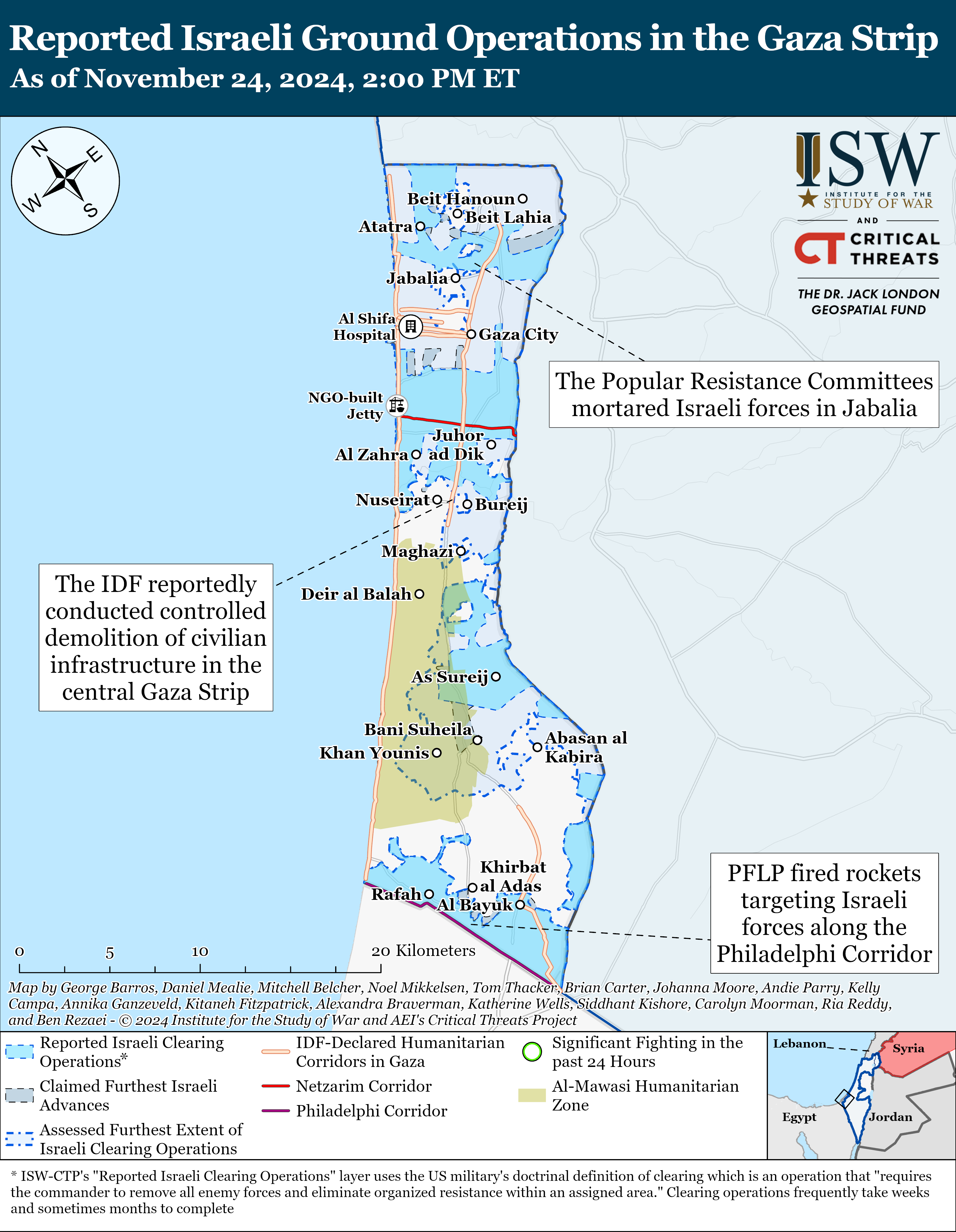 The IDF 162nd Division likely continued clearing operations around the Jabalia refugee camp in the northern Gaza Strip on November 24. A Palestinian journalist reported IDF gunfire in the northern part of Jabalia refugee camp.[43] The Popular Resistance Committees mortared Israeli forces in Jabalia on November 24.[44]