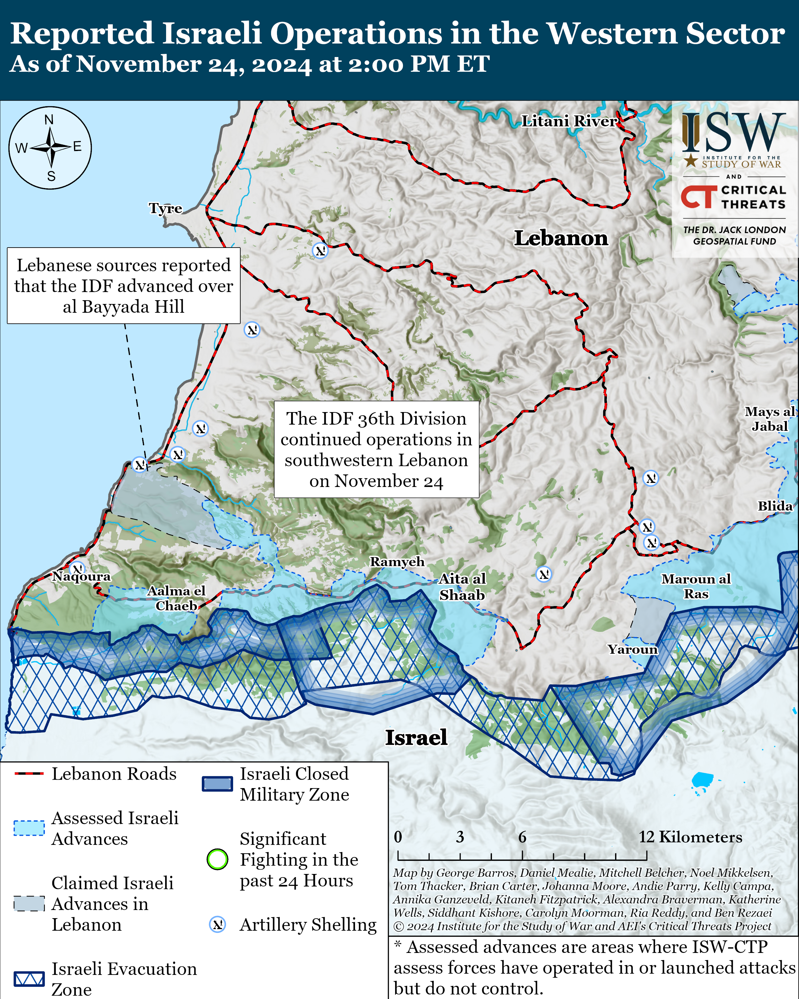 Lebanese sources reported on November 22 that the IDF advanced over al Bayyada Hill, which is on the Lebanese coast north of Naqoura.[64] A Lebanese journalist posted videos of purported anti-tank guided missiles launched at Israeli tanks positioned on al Bayyada Hill overlooking the Lebanese coast.[65] Geolocated imagery has suggested Israeli forces have been advancing towards the hill in recent days.[66] Al Bayyada Hill overlooks UNIFIL Position 1-26 and a nearby Hezbollah military site. The hill also provides Israeli forces with an advantageous position to monitor Hezbollah activity along the coast.[67] Hezbollah-affiliated media reported that Hezbollah fired numerous anti-tank missiles targeting Israeli tanks near al Bayyada town’s eastern outskirts.[68] Hezbollah also claimed to engage Israeli forces with small arms and rockets on al Bayyada town’s northeastern outskirts.[69] Lebanese sources reported Israeli artillery shelling in the area.[70]