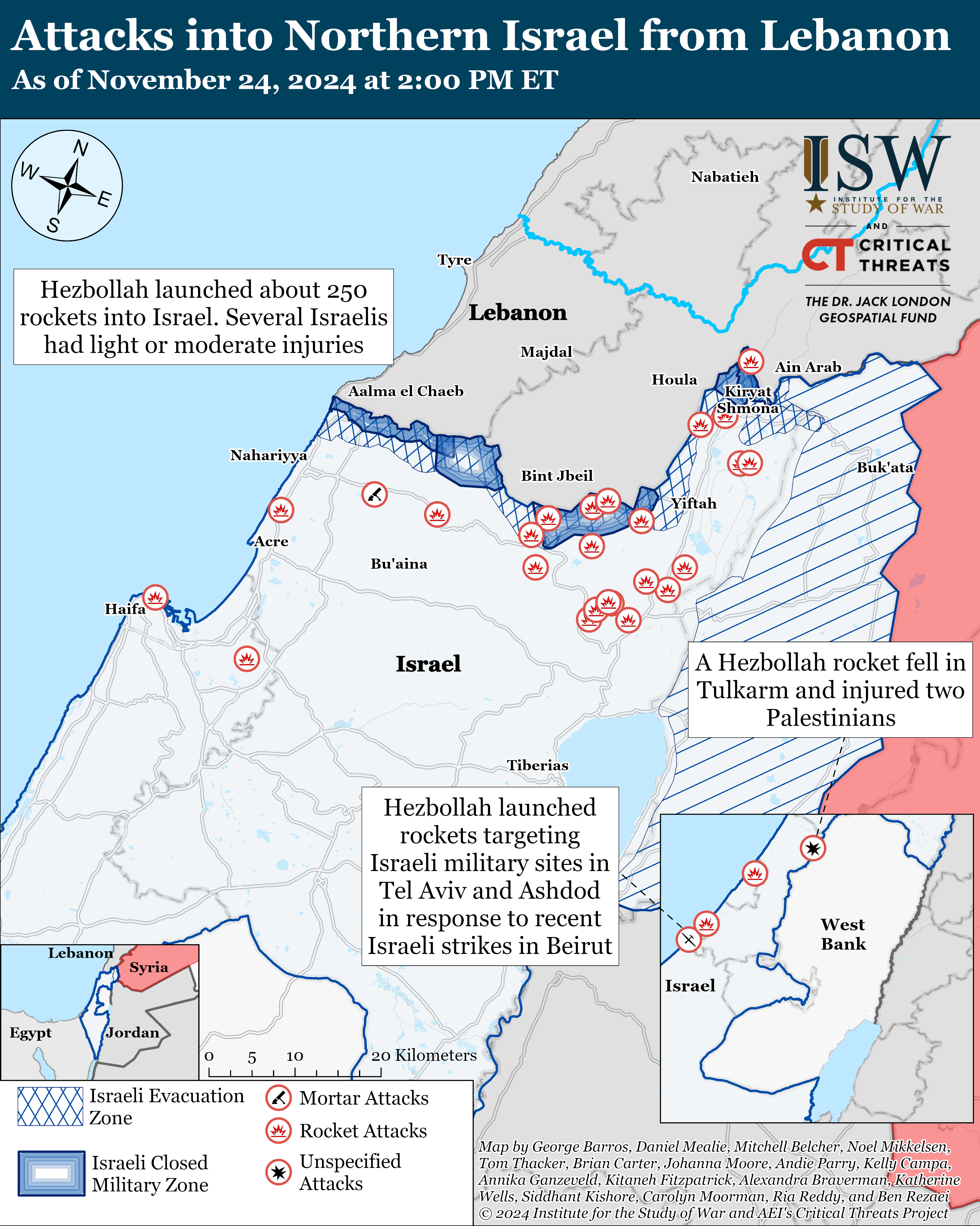 - Hezbollah Operations: Lebanese Hezbollah likely fired large numbers of rockets at Israel to pressure the Israeli government during ongoing ceasefire negotiations. Hezbollah fired about 250 rockets at civilian and military targets in Israel in seven hours on November 24, according to IDF reports. Hezbollah is likely attempting to demonstrate to the Israeli government and people that continuing the IDF’s military operations will not create entirely safe conditions to return northern Israelis to their homes and that a ceasefire deal is the only viable way to accomplish Israeli war aims. One of Israel’s stated war aims is to return Israeli civilians to their homes in the north.