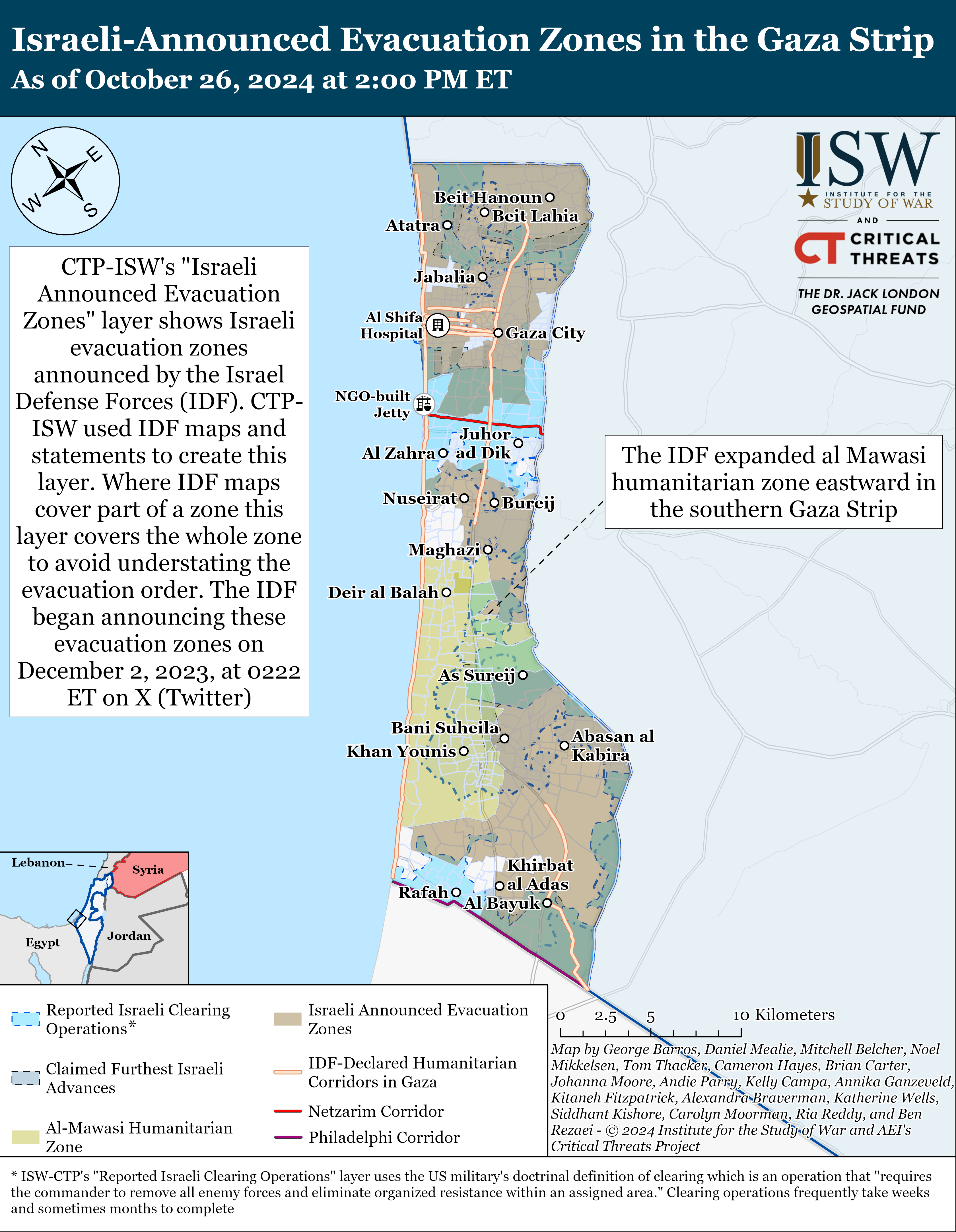 The IDF expanded al Mawasi humanitarian zone eastward on October 26.[18] The IDF has repeatedly released evacuation orders for Palestinian civilians in Jabalia and the surrounding areas, telling residents to travel south to al Mawasi humanitarian zone.[19] The IDF continues to operate in the northern Gaza Strip since it launched a new clearing operation into Jabalia refugee camp on October 6 in order to disrupt Hamas reconstitution efforts.[20]